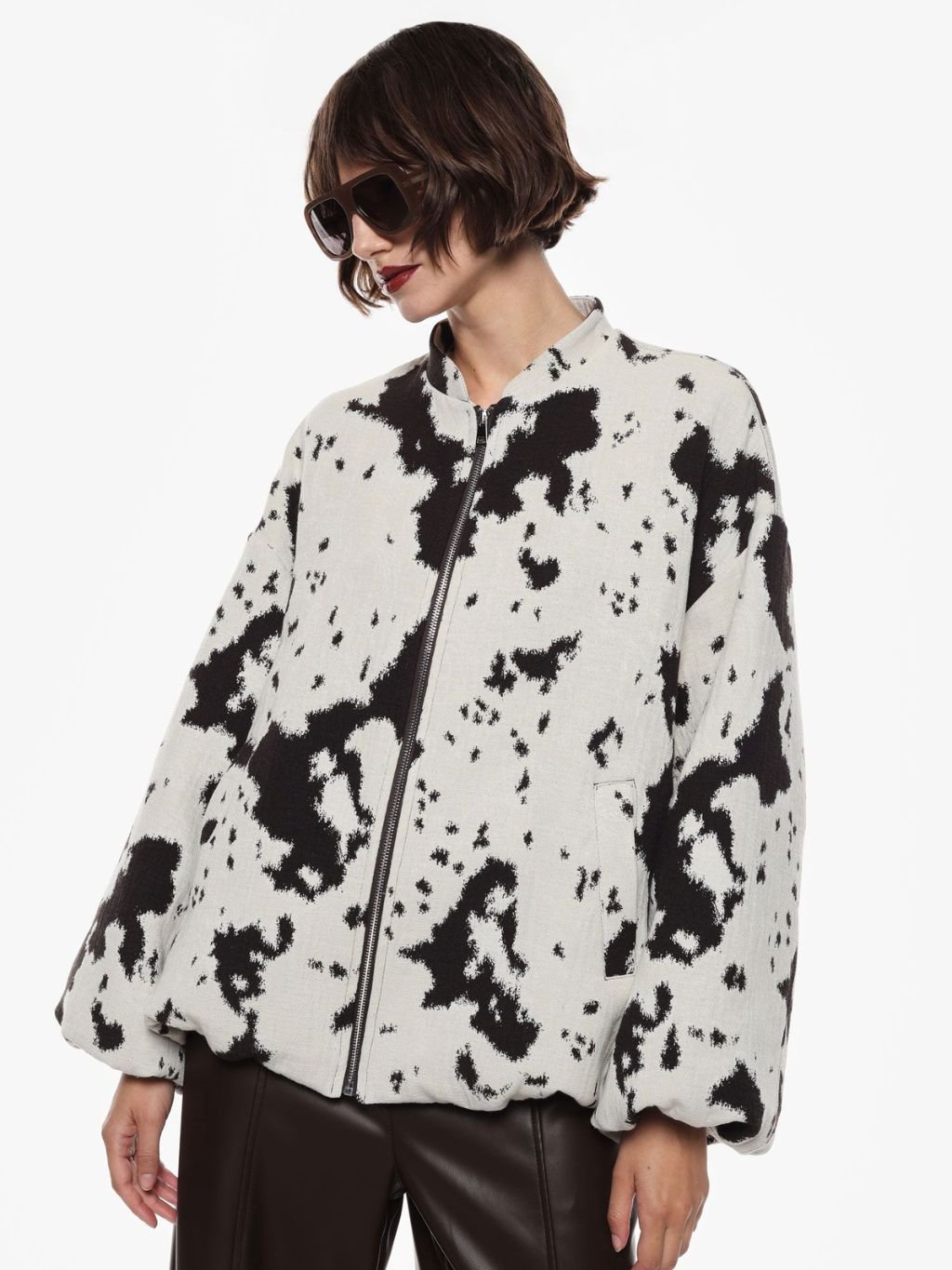 Tato sofistikovaná verze klasické bomber bundy spojuje uvolněný design s výrazným potiskem a nabízí možnost obohatit jakýkoli šatník. Volný střih a zapínání na zip poskytují pohodlí a funkčnost, díky čemuž je ideální pro městský život. Noste ji, abyste vyjádřili svoji individualitu s nadčasovým stylem.