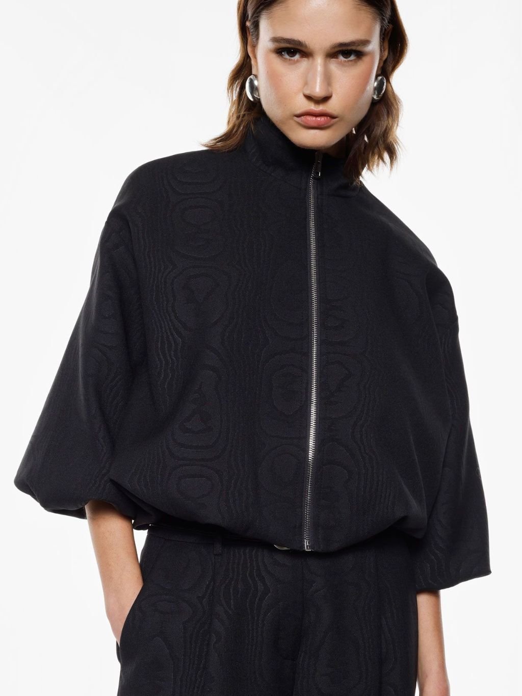 Moderní pohled na bomber bundu s objemnou siluetou a tříčtvrtečními rukávy, které jsou umocněny reliéfním vzorem ve stejném odstínu. Zapínání na zip po celé délce a zaoblený límec dodávají bundě všestrannost, díky čemuž je tento kousek vynikající volbou pro sofistikované a individualistické outfity.