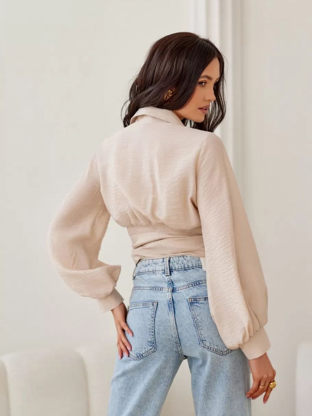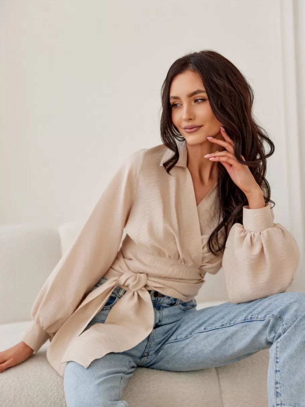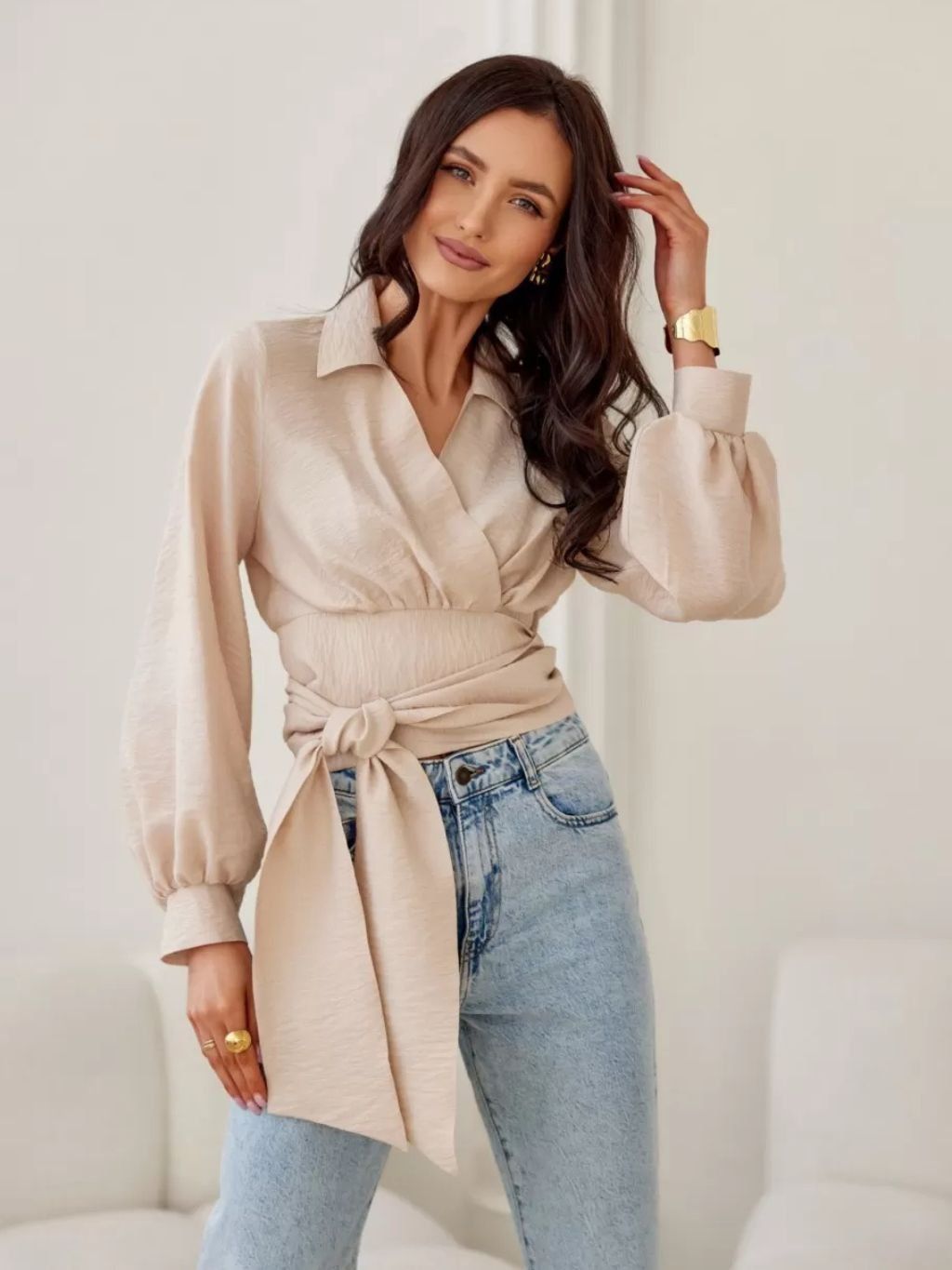 Krátká halenka s límcem a řaseným výstřihem, zavazováním v pase a dlouhými nafouknutými rukávy. Model se zkrácenou délkou z nové jarní kolekce.