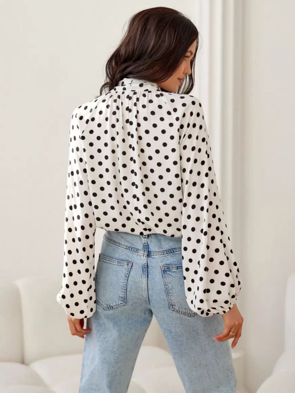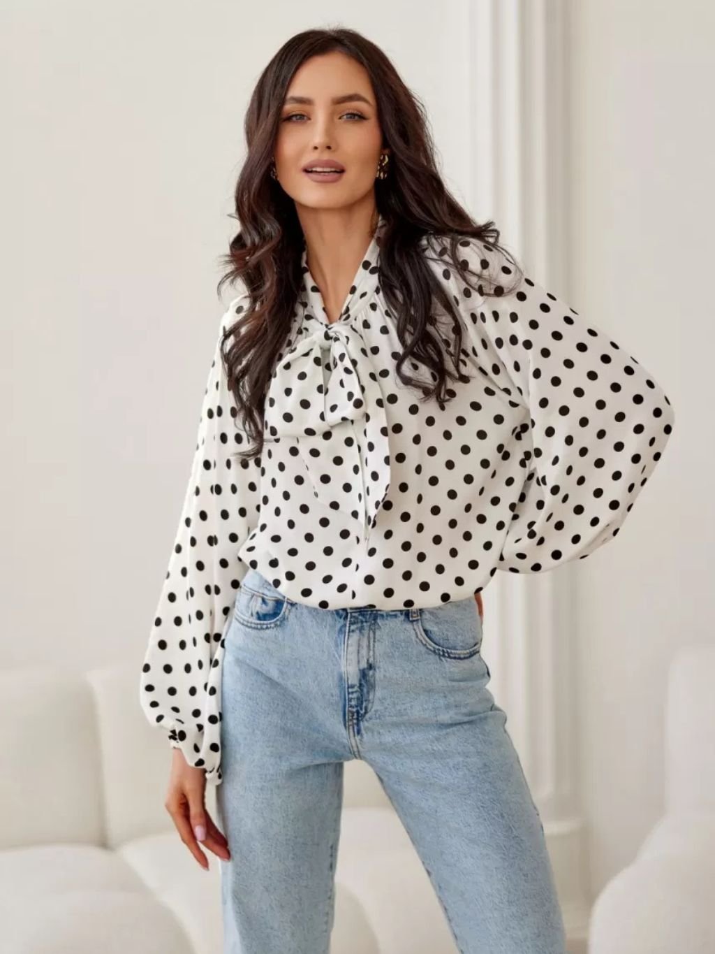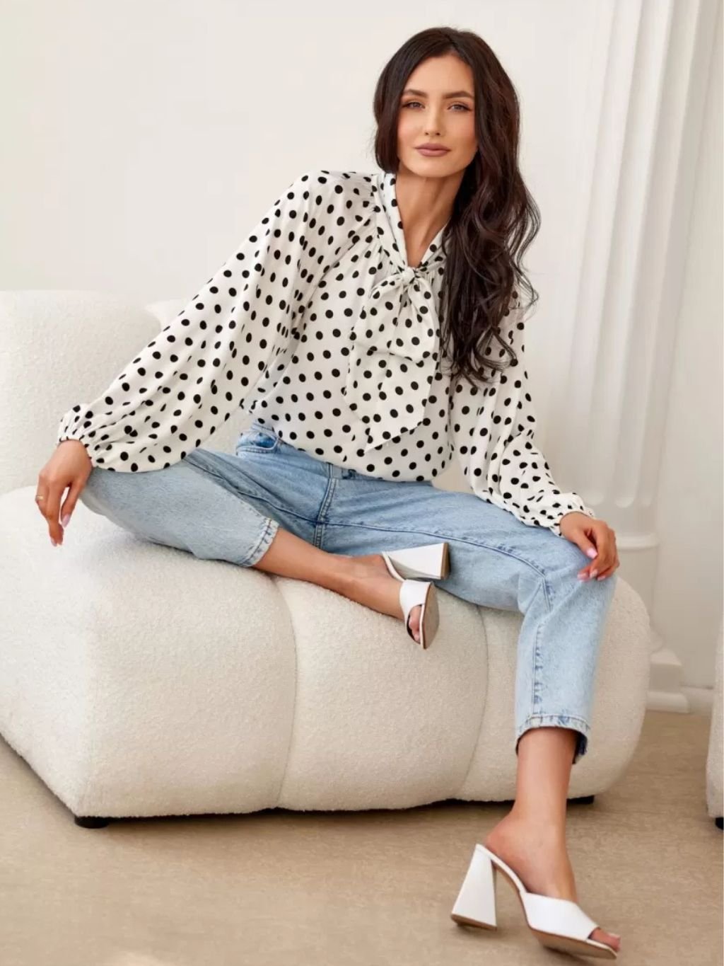 Dámská halenka s dlouhými nafouknutými rukávy zakončenými gumičkou, ve výstřihu má ozdobné zavazování z nové jarní kolekce.
