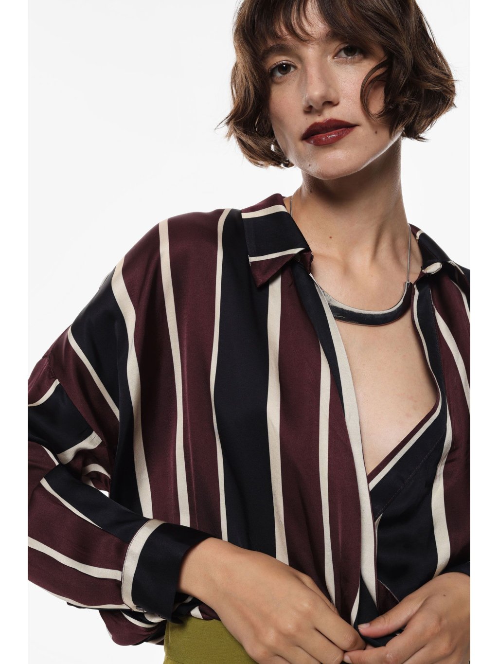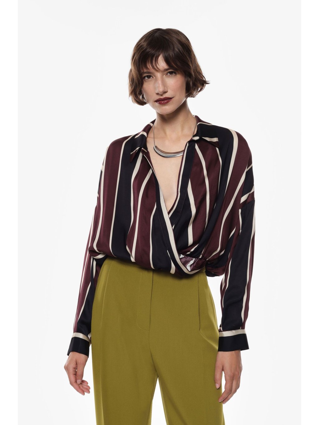 Objavte harmóniu línií v tejto pruhovanej košeli, ktorá spája zavinovaciu siluetu s ladnosťou špicatého goliera. Dlhé rukávy dodávajú nádych každodennej elegancie, zatiaľ čo výstrih do V vytvára podmanivú hru kontrastov. Odev, ktorý premení každý deň na príležitosť odhaliť svoj osobný štýl.