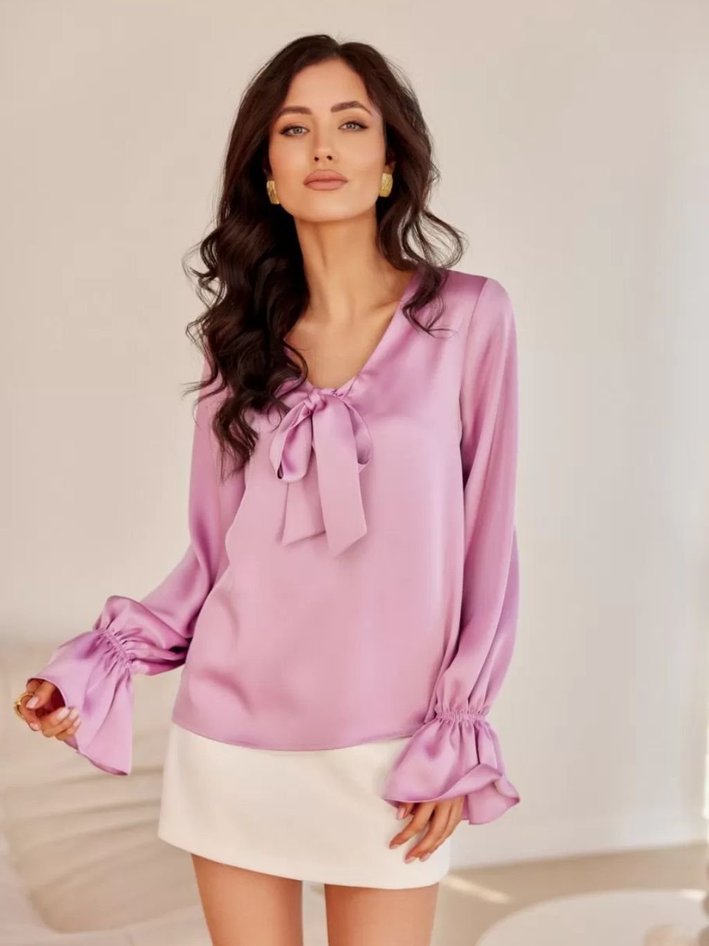 Dámska blúzka s dlhými rukávmi zakončenými gumičkou, vo výstrihu má ozdobné zaväzovanie z novej jarnej kolekcie.