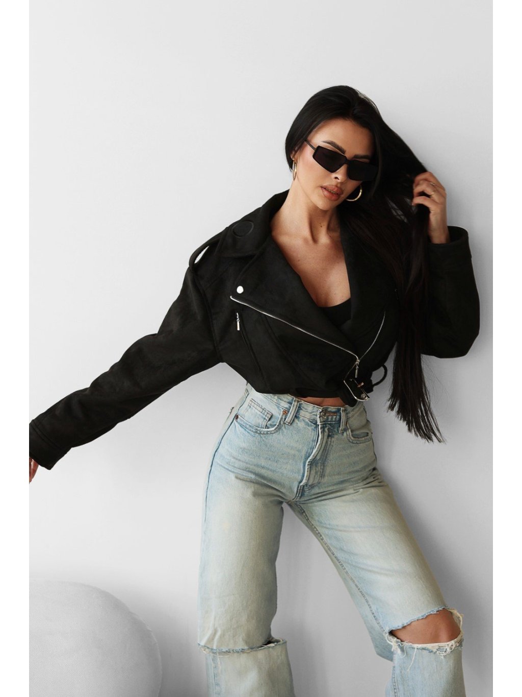 Modelka je vysoká 165 cm a má na sebe veľkosť S. Semišový kabát kratšieho strihu. Predné vrecká. V páse opasok, ktorý dokonale zvýrazní postavu. Veľká 3D výšivka na golieri s logom značky OLAVOGA.