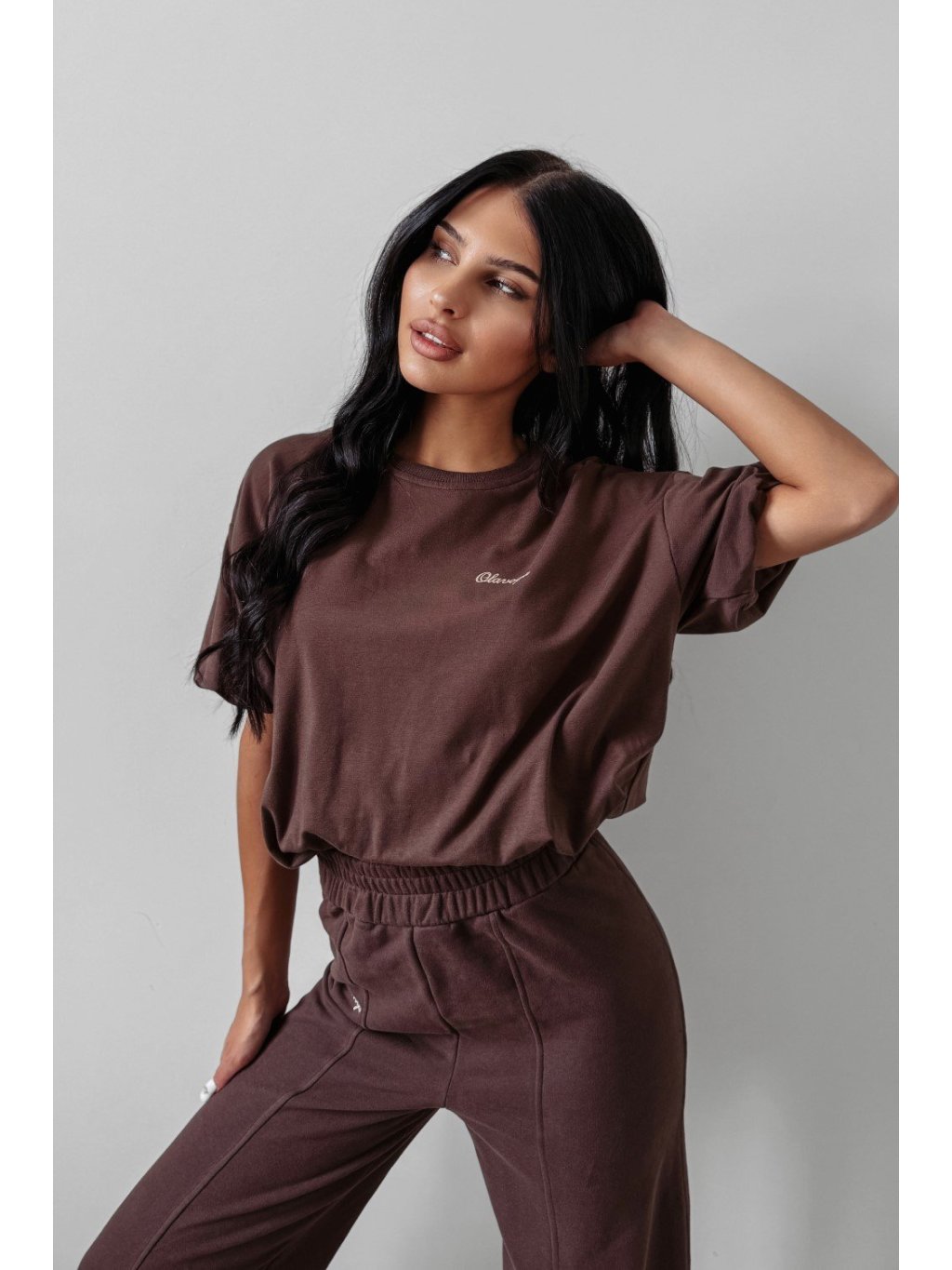 Modelka má výšku 165 cm a nosí velikost S. Triko s krátkým rukávem, přiléhavé, vyrobené z vysoce kvalitní elastické BAVLNY. Ramena mají mírně nafouknutý design rukávů, který vytváří jemný, elegantní vzhled. Přední část zdobí ručně psané logo OLAVOGA v kontrastním odstínu. Dokonale ladí s kalhotami AUTUMN WHISPER.