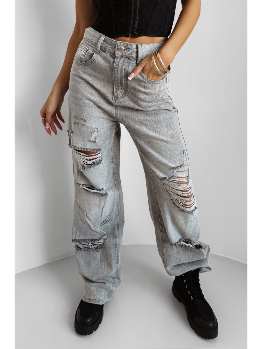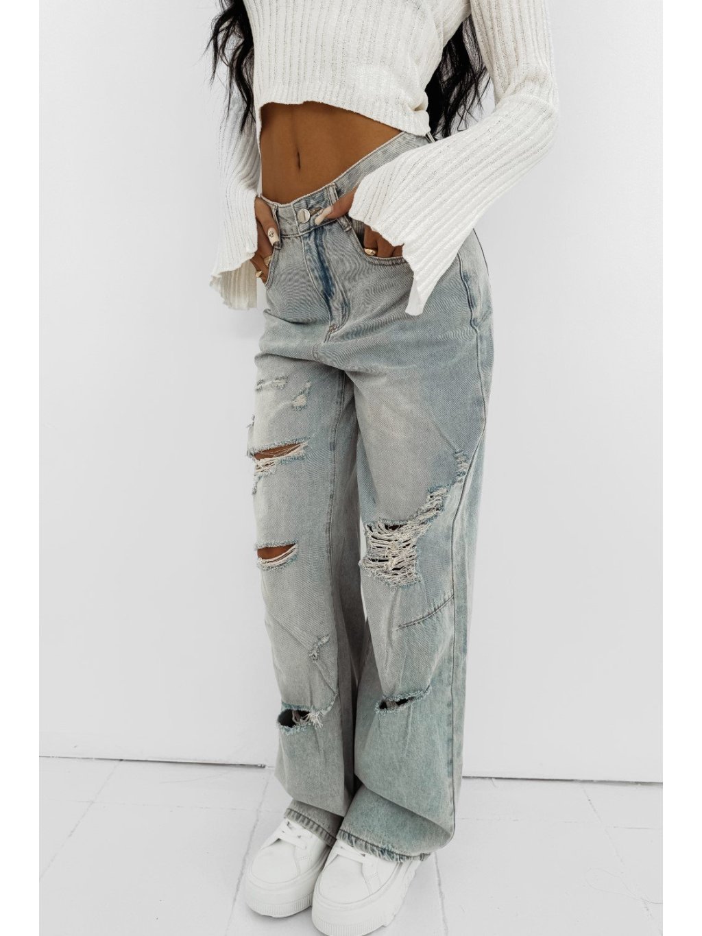 Rifľové nohavice vo vintage štýle s opotrebovaním. Rovný strih, vysoký pás. Klasický dizajn s piatimi vreckami, zapínanie na gombík a zips.Zloženie: 97 % bavlna, 3 % elastan