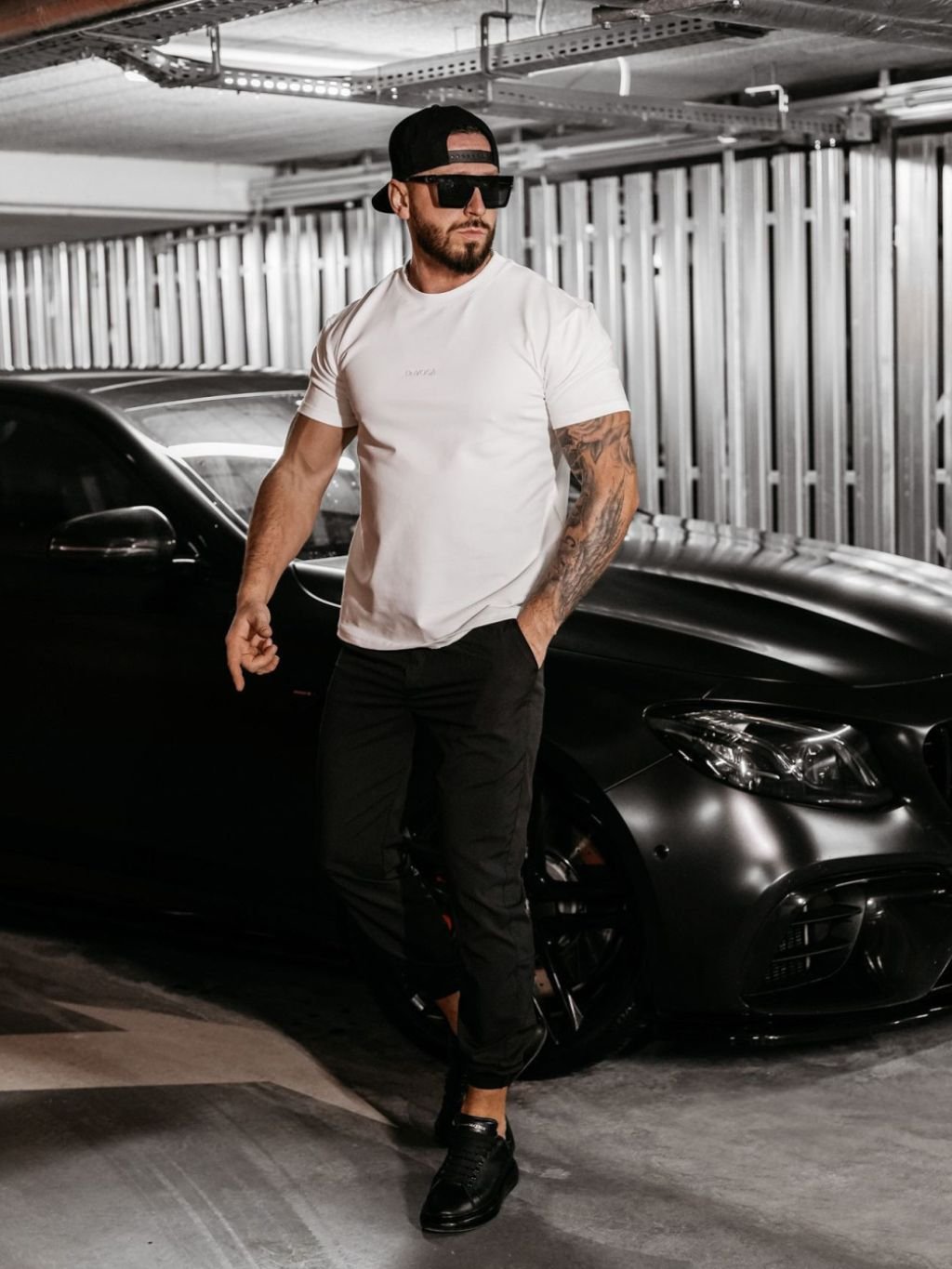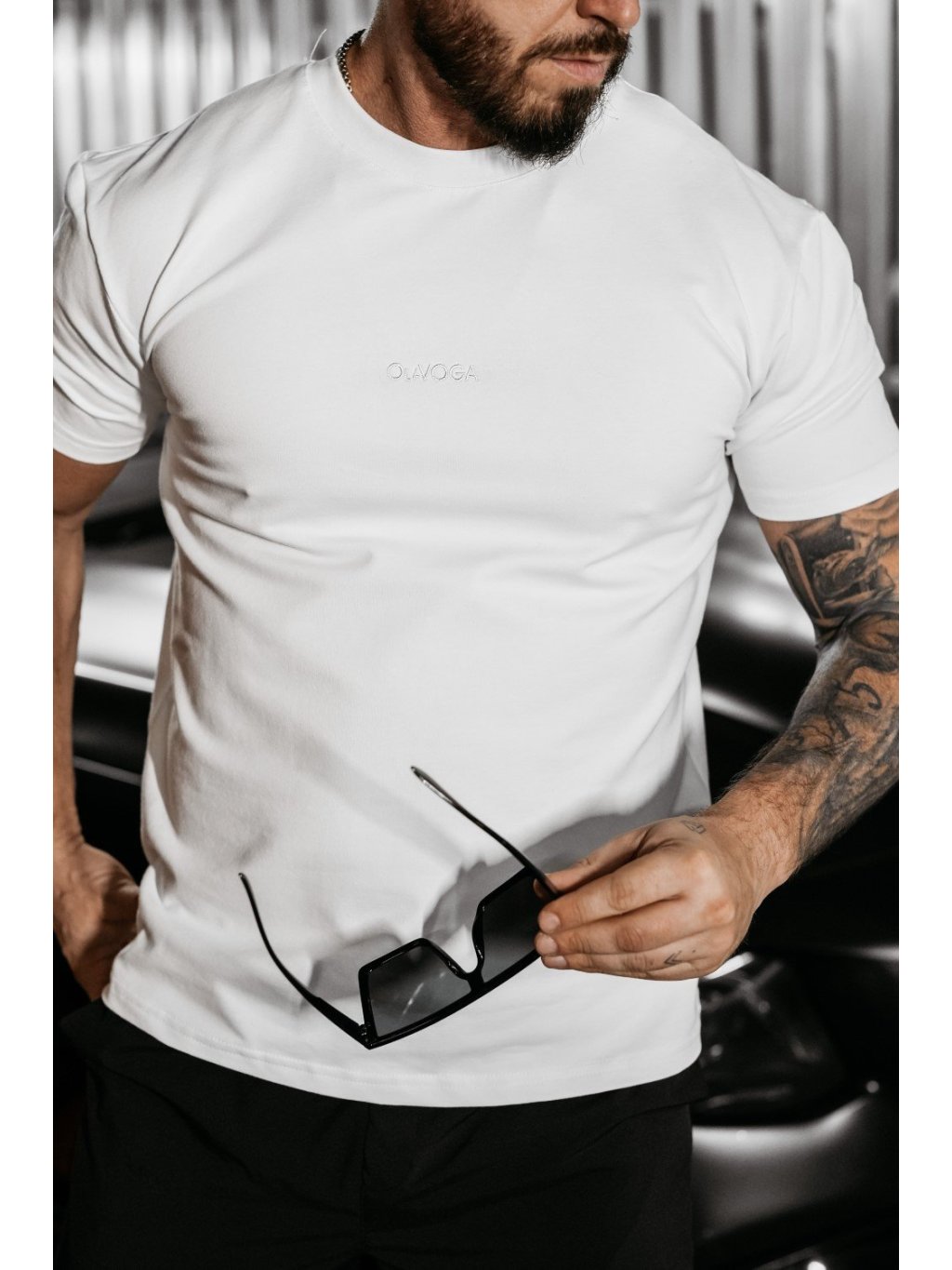 Na prednej strane je minimalistická výšivka loga OLAVOGA v rovnakej farbe ako tričko. Na zadnej strane zvýrazňuje dizajn veľká čierna grafika auta, ako aj minimalistické značky a nápisy.