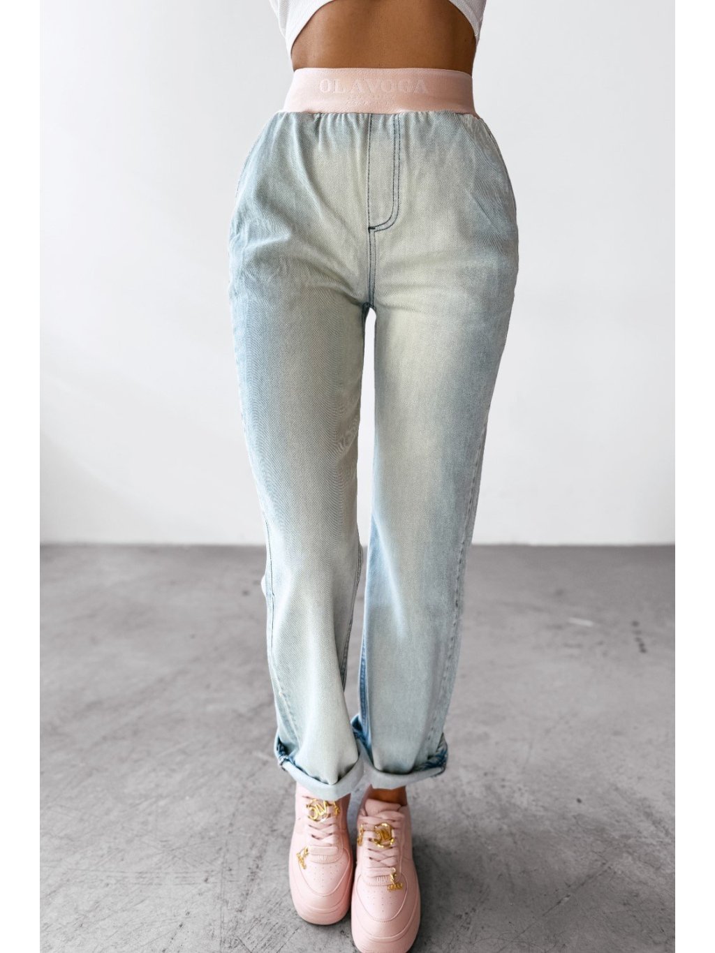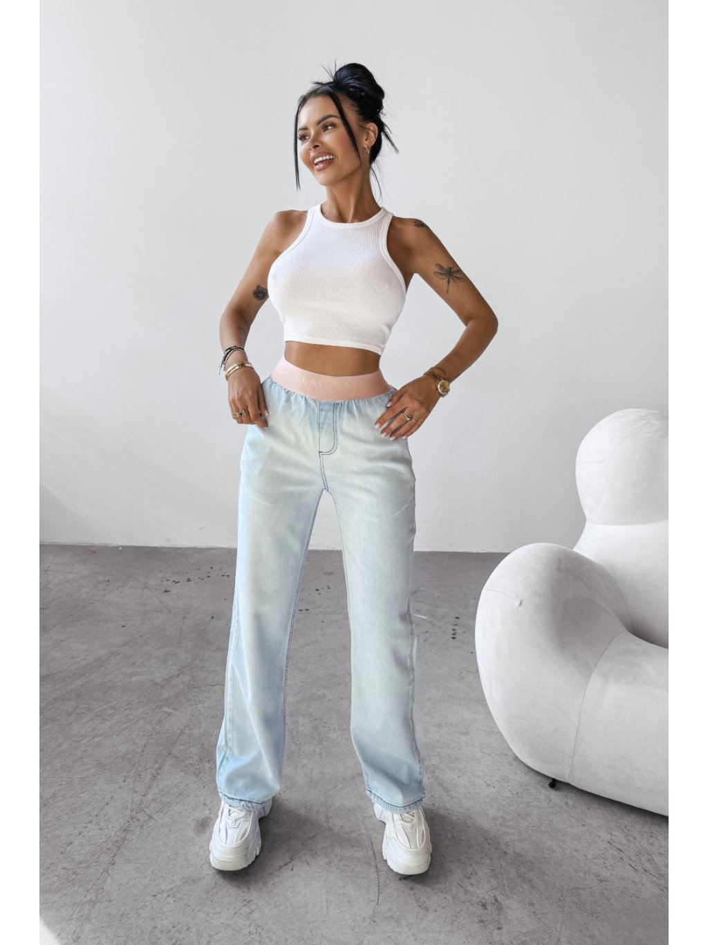 Modelka meria 165 cm a má na sebe veľkosť S. Dámske nohavice denimového typu ležérneho strihu z kvalitného, mierne elastického bavlneného materiálu. Štýl s vysokým pásom a vreckami na prednej a zadnej strane. Pás má gumu s logom a nohavice mierne rozšírené smerom nadol, čo zaisťuje moderný a pohodlný strih.Materiálové zloženie: 85 % bavlna, 15 % polyester