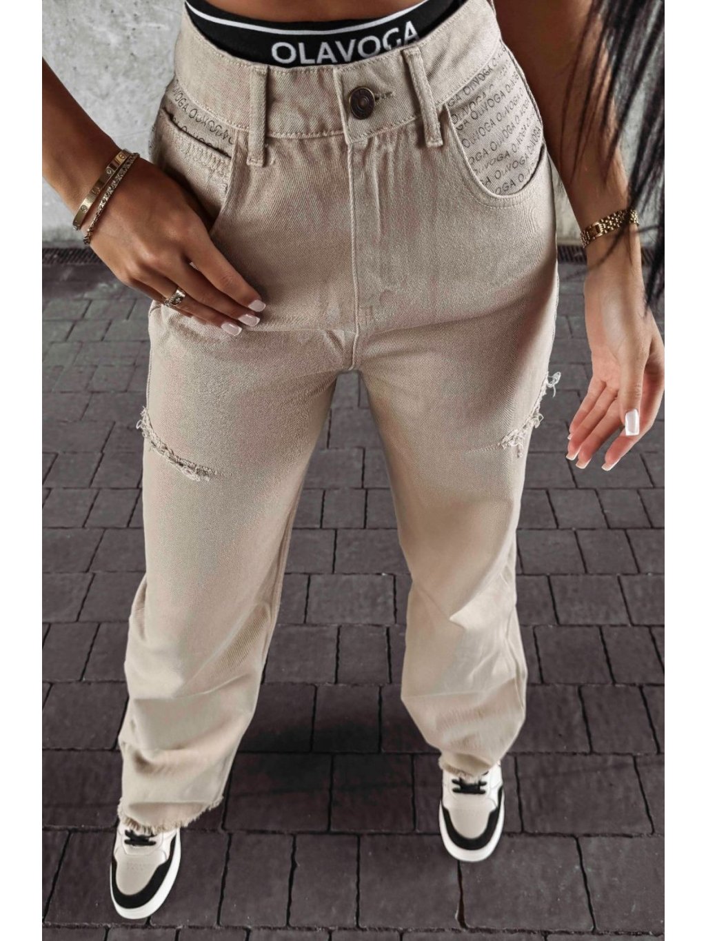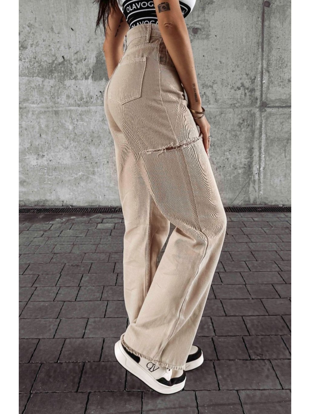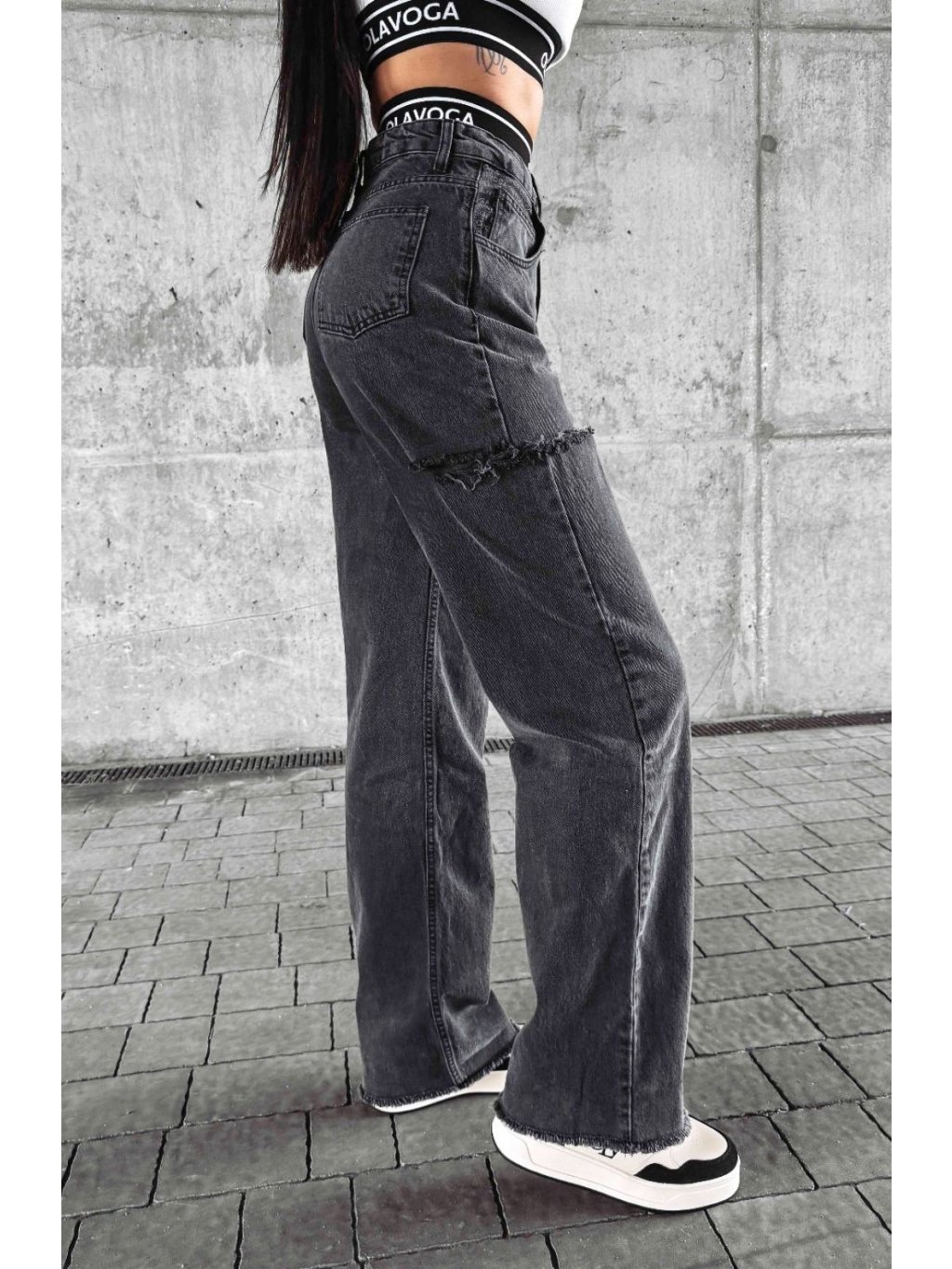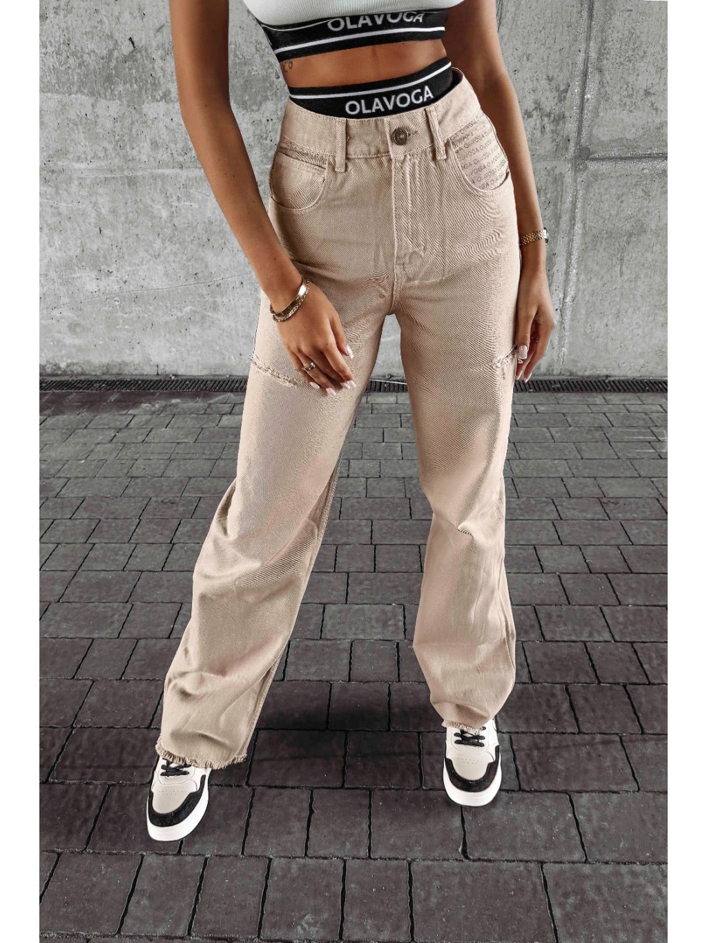 Vyrobené z kvalitnej, flexibilnej BAVLNY. Vysoký pás. Na bokoch sú rozparky. Majú gombík s logom a na bokoch vrecká. Na spodnej časti sa nohavice nadol rozširujú.