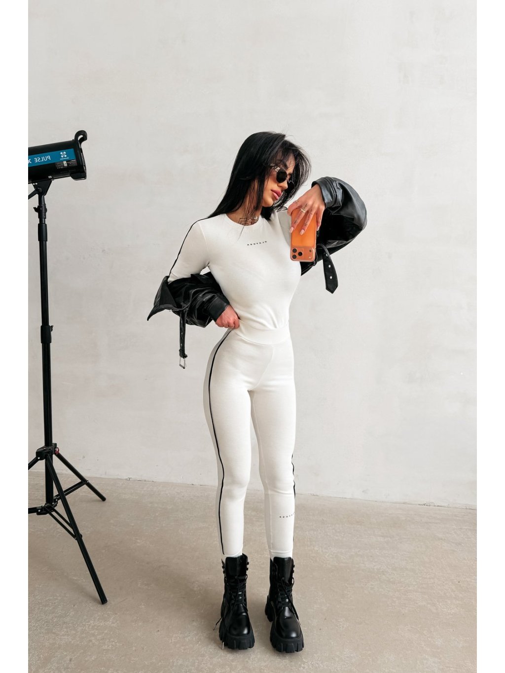 Ležérní sada vyrobená z měkké, elastické, jemně texturované pleteniny. Vrchní část: Přiléhavé triko s dlouhým rukávem v klasickém střihu, které zvýrazňuje postavu. Dlouhé rukávy s jemnými manžetami a kontrastními stuhami na okrajích. Minimalistické logo OLAVOGA vpředu. Spodní část: Legíny s vysokým pasem, zúženými kalhotami a elastickými konci. Kalhoty mají logo ve stejném stylu jako vrchní díl.Složení: 90% bavlna, 10% polyester