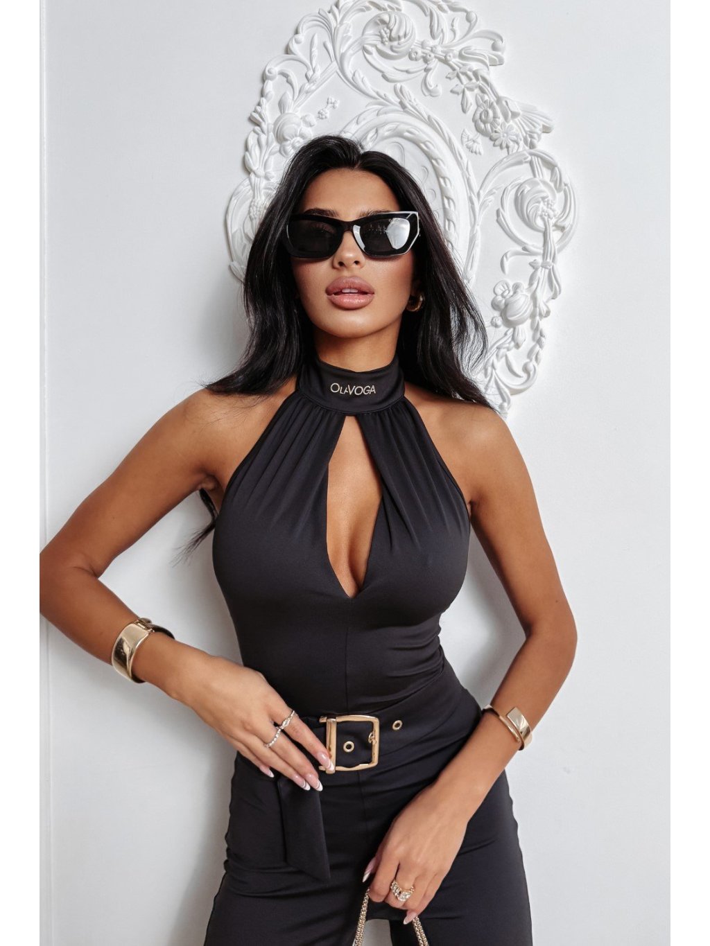 Dokonale padnoucí overal s elegantním stojáčkem a smyslným výstřihem do V. Vyroben z elastického, příjemného materiálu na dotek. Hřbet je vykrojený, což mu dodává přiléhavý a výrazný vzhled. Stojáček je zdoben vyšívaným logem OLAVOGA. Opasek se zlatou přezkou krásně zvýrazňuje pas. Kalhoty jsou přiléhavé k tělu. Složení: 80% nylon, 20% elastan Rozměry a velikosti: S, M Celková délka: 136 cm, 137 cm cm, 56 cm