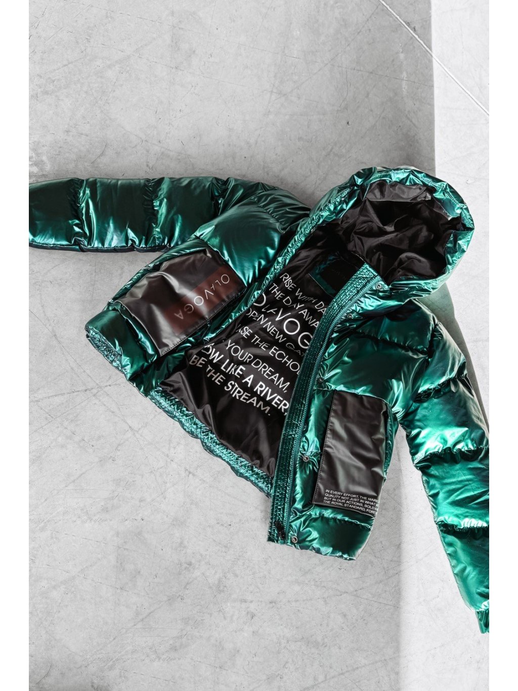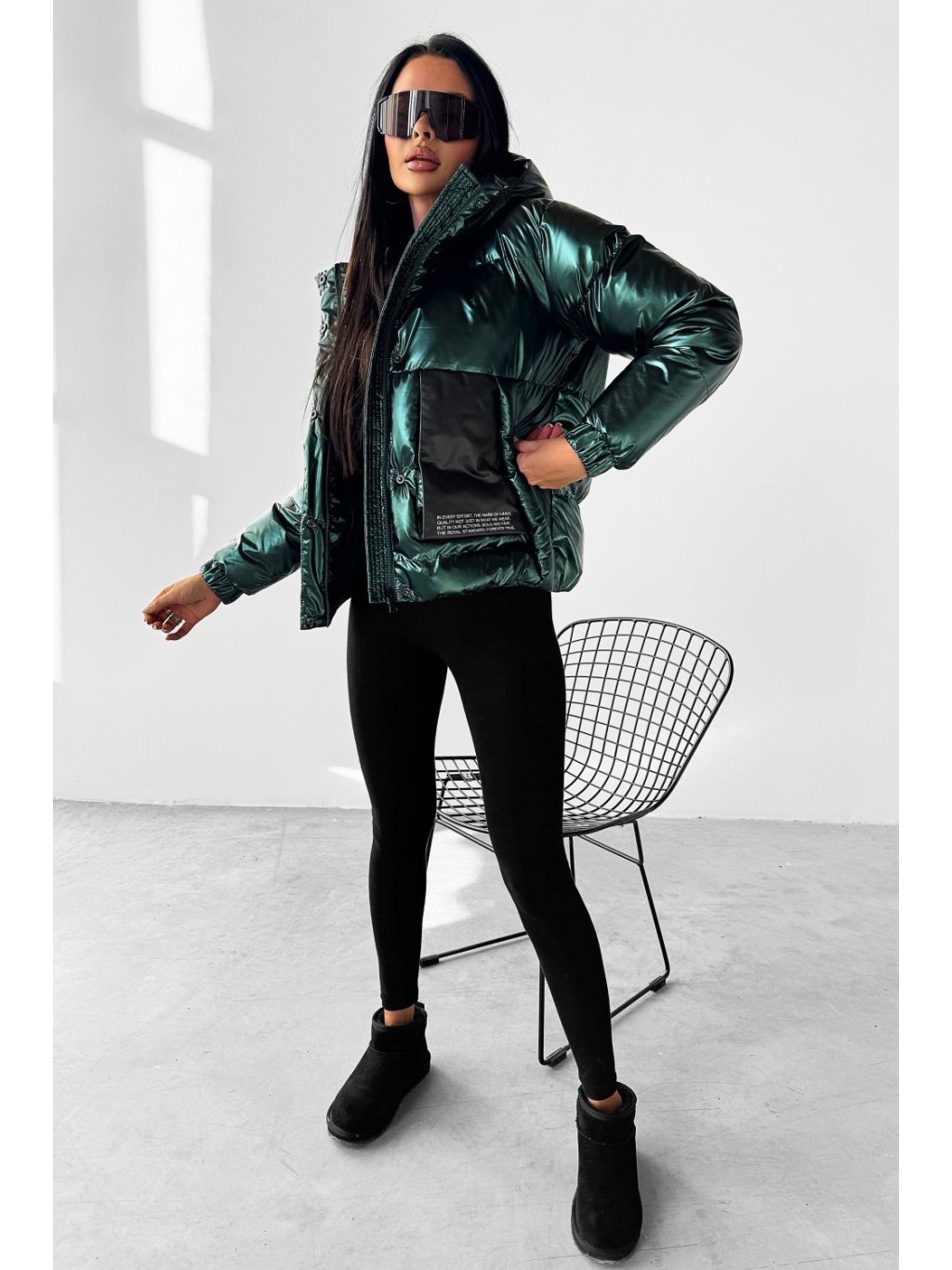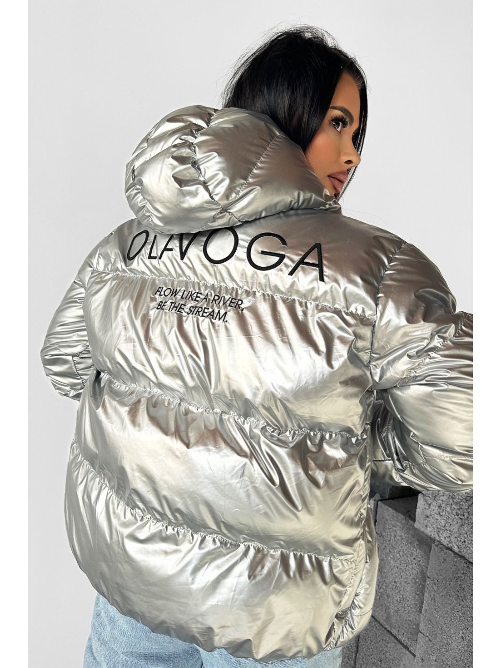 Modelka meria 165 cm a má na sebe veľkosť S.Prešívaná bomber bunda s metalickým efektom a kapucňou v prevedení rovného strihu. Moderná bomber bunda s vreckami vpredu, 3D vyšívané logo OLAVOGA na chrbte s minimalistickým nápisom. Vnútorné vrecko pre praktickosť.