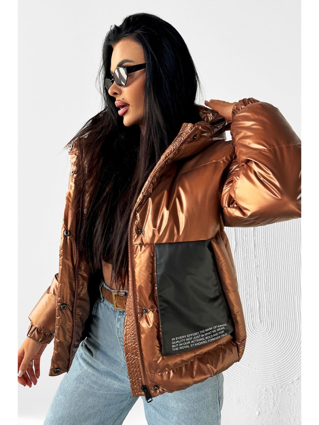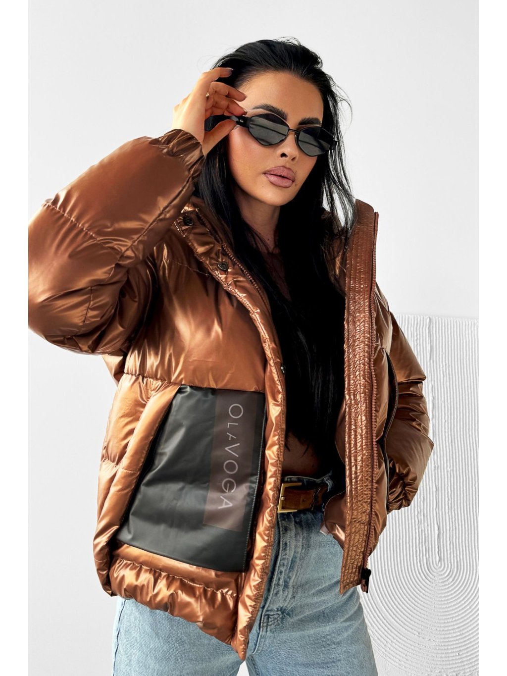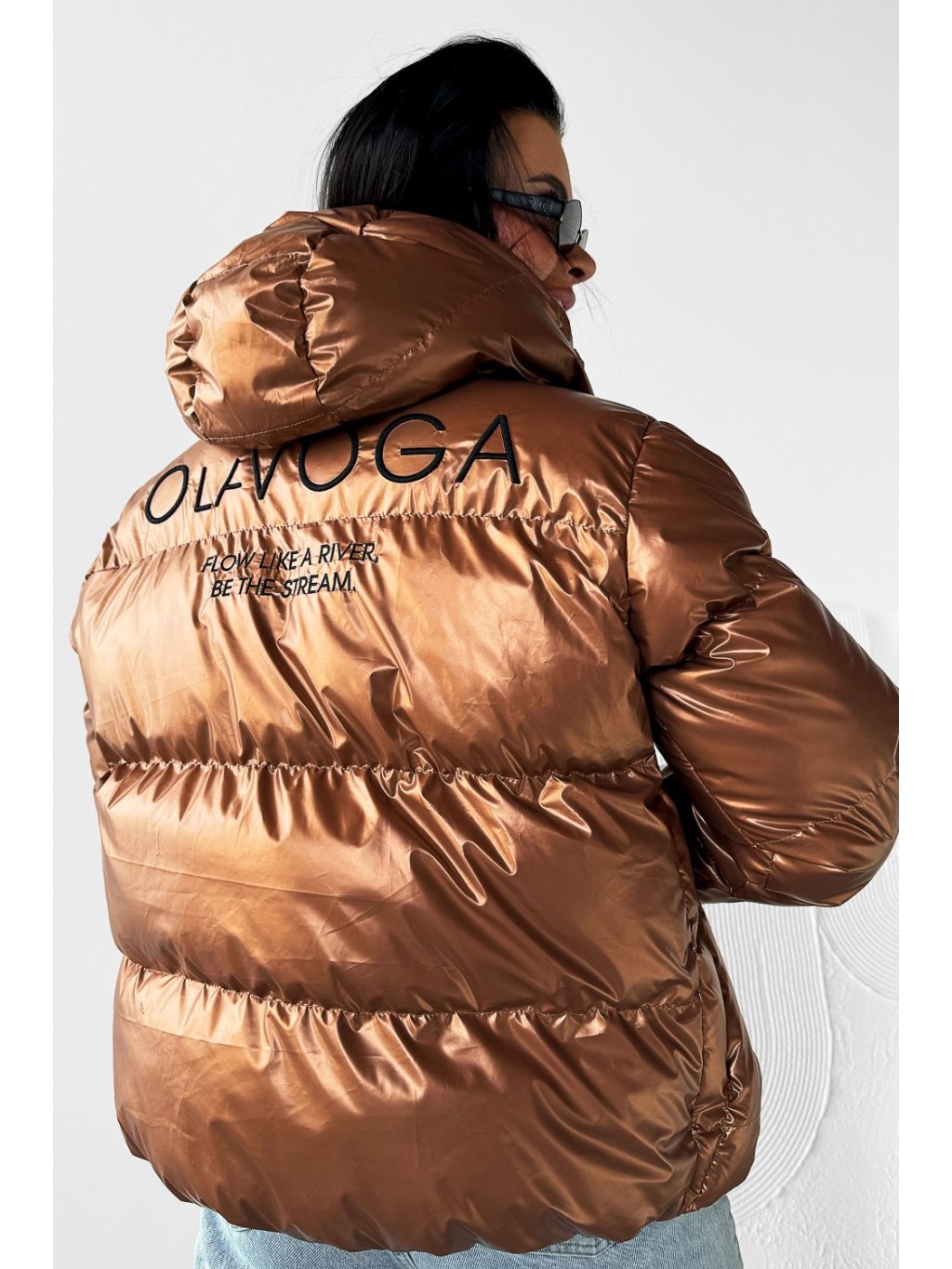 Modelka meria 165 cm a má na sebe veľkosť S.Prešívaná bomber bunda s metalickým efektom a kapucňou v prevedení rovného strihu. Moderná bomber bunda s vreckami vpredu, 3D vyšívané logo OLAVOGA na chrbte s minimalistickým nápisom. Vnútorné vrecko pre praktickosť.