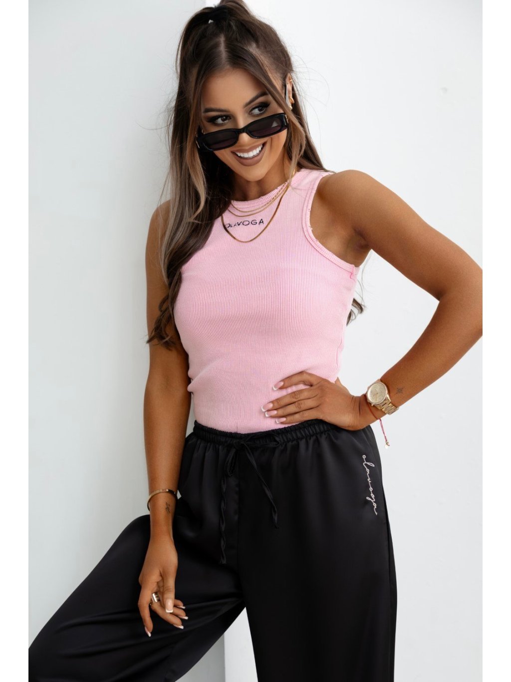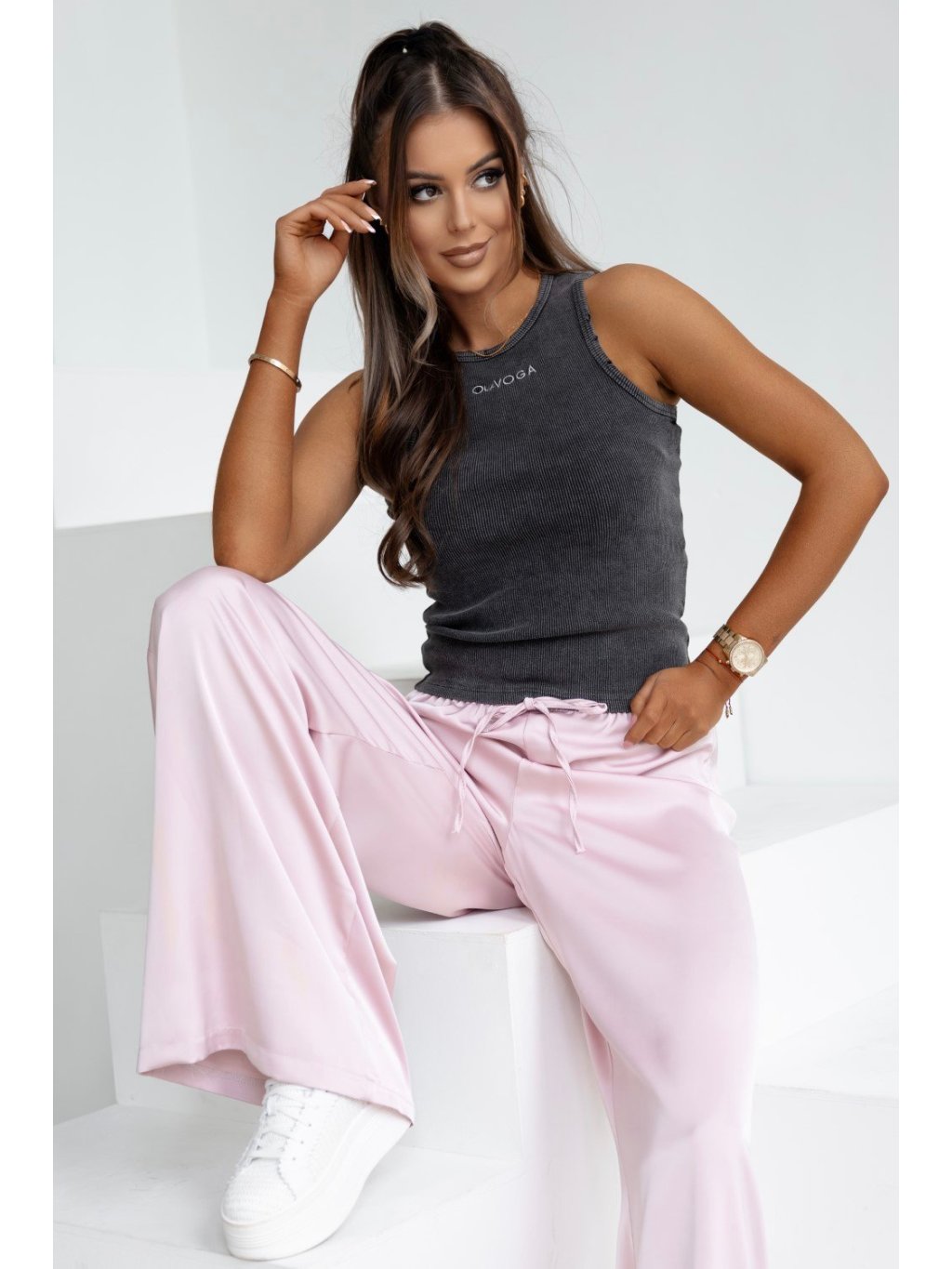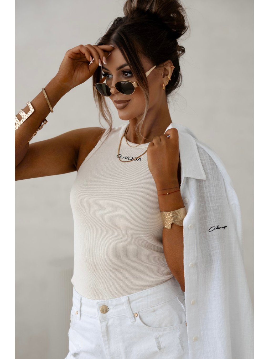 Modelka má výšku 165 cm a nosí veľkosť S. Priliehavý top bez rukávov vyrobený z vysoko kvalitnej, elastickej, rebrovanej bavlny. Okraje sú mierne zubaté a zdobené, vďaka čomu sú výnimočné. Kontrastná výšivka loga OLAVOGA na prednej strane.Zloženie: 92 % bavlna, 8 % elastan