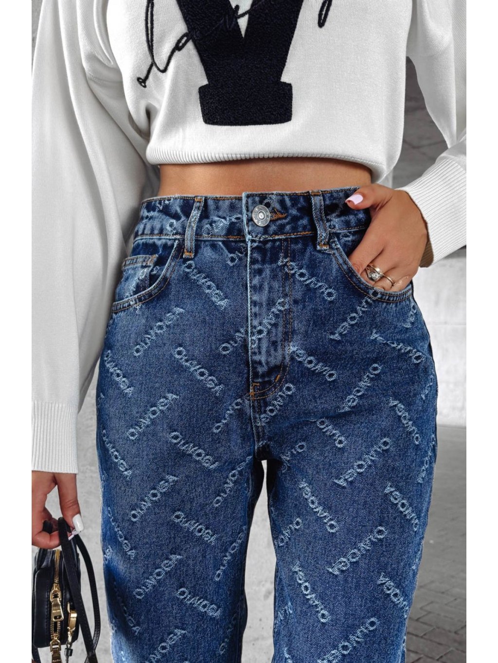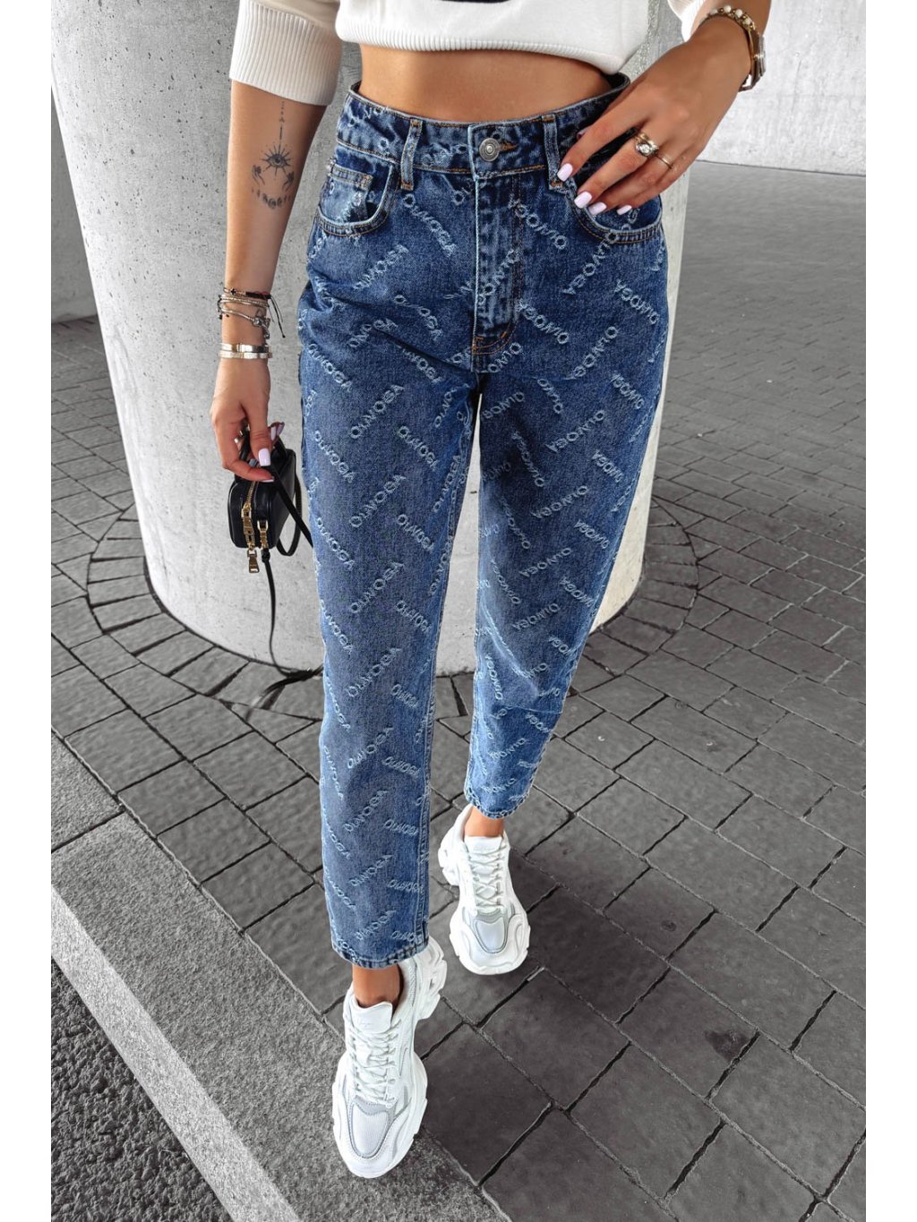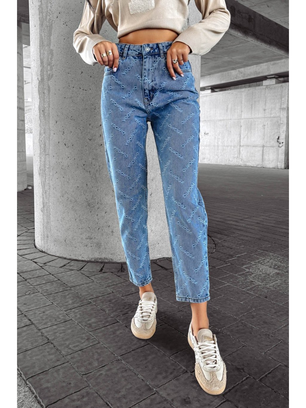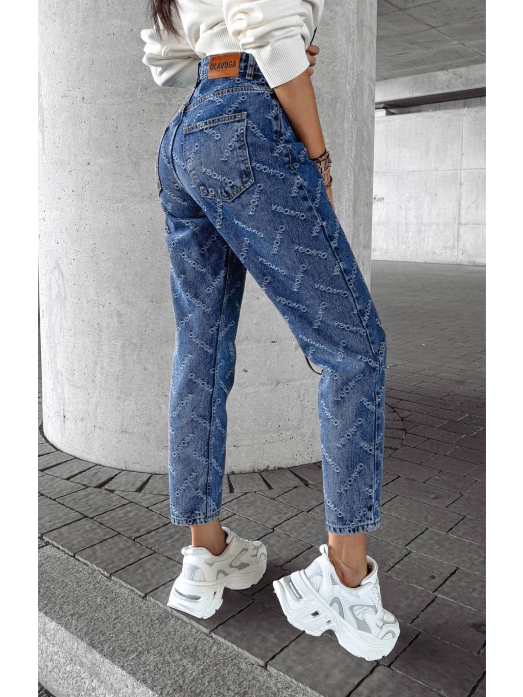 Džínsový typ mom jeans, s prednými a zadnými vreckami. Nohavice sa zapínajú na gombík s logom a zdobí ich logo Olavoga. Na zadnej strane je kožený štítok aj s logom Olavoga.
