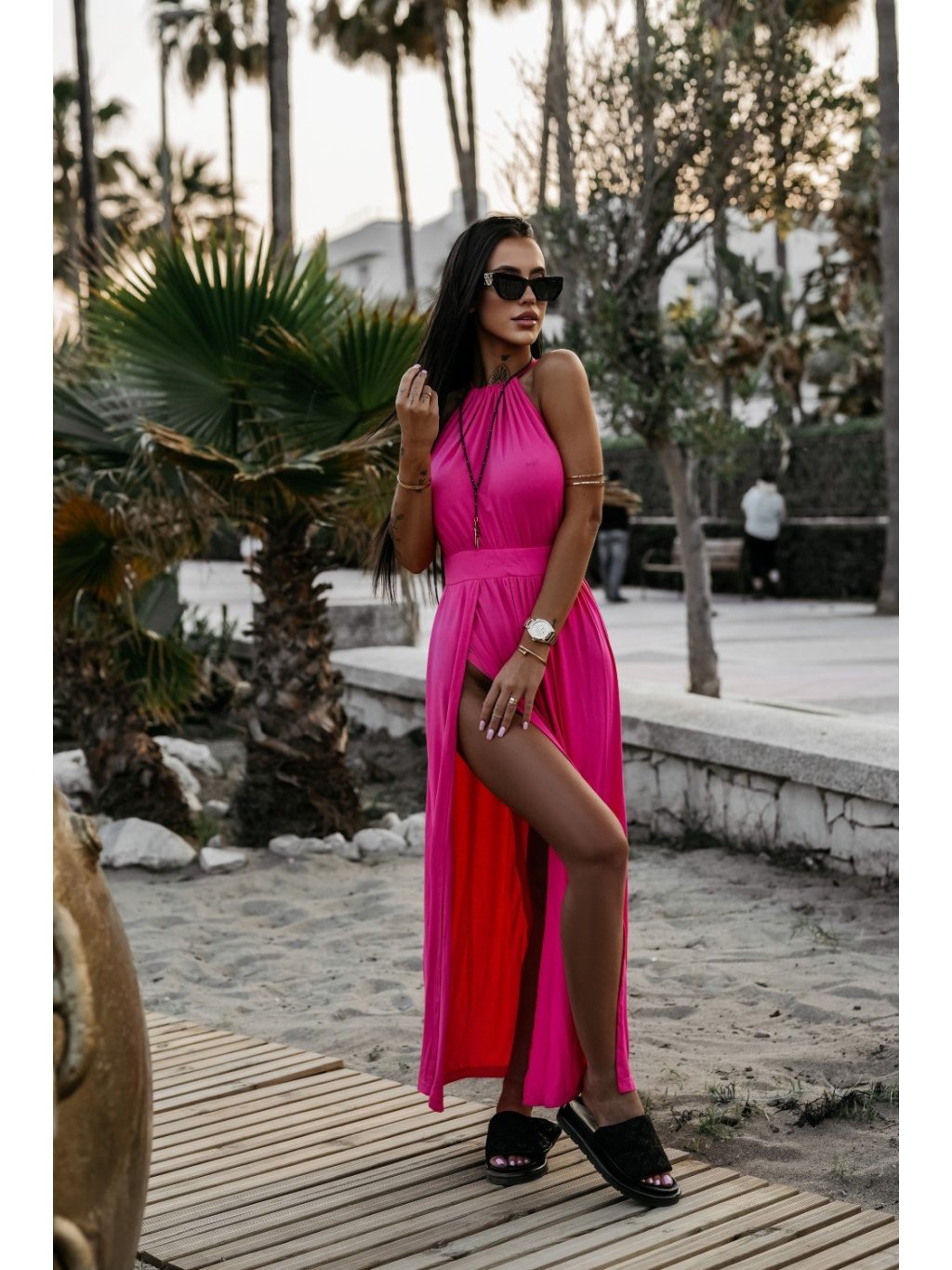 Modelka má výšku 165 cm a nosí velikost S. Maxi šaty bez rukávů, vyrobené ze 100% VISKÓZY. Vrch má uzavřený výstřih se zavazováním u krku. Široký, tvarovaný pásek v pase zvýrazňuje postavu, na kterém je výšivka loga OLAVOGA, která ladí s barvou šatů. Hluboké rozparky na bocích dělají střih speciálním a Vypasovaným.