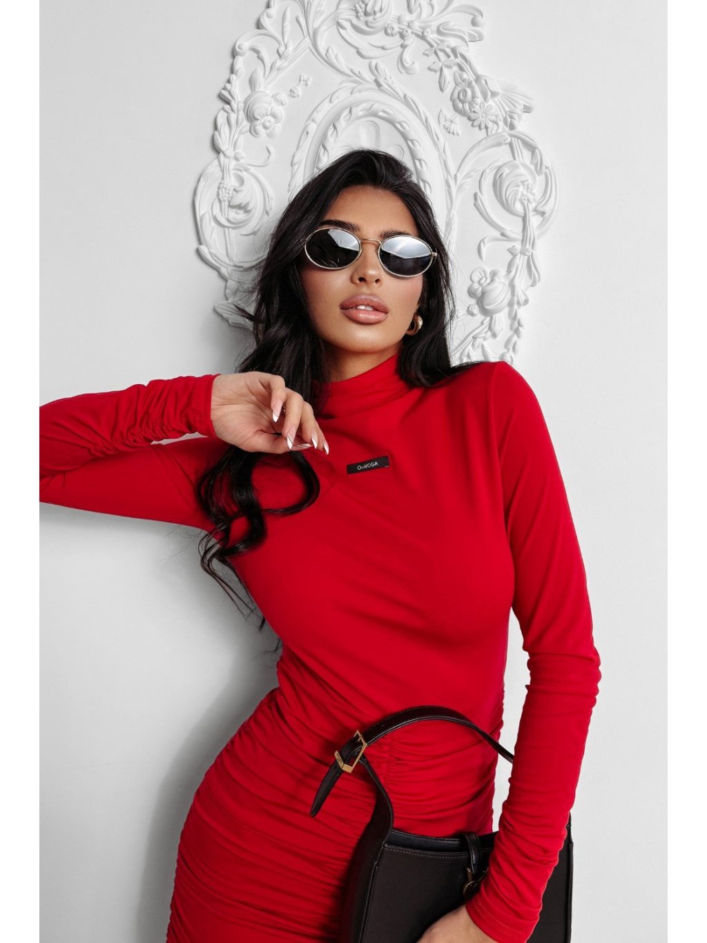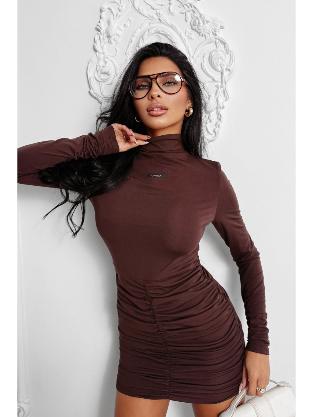 Dokonale padnoucí šaty s dlouhými rukávy a vysokým stojáčkem. Vyrobeno z kvalitního, elastického a lesklého materiálu. Model je zdoben efektním volánem po celé délce. Na přední straně je štítek s logem značky OLAVOGA.