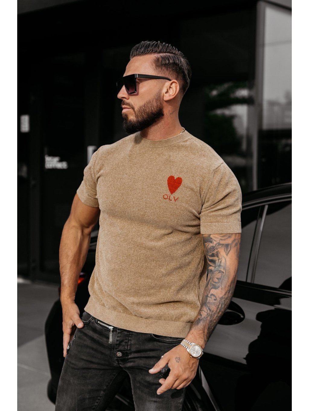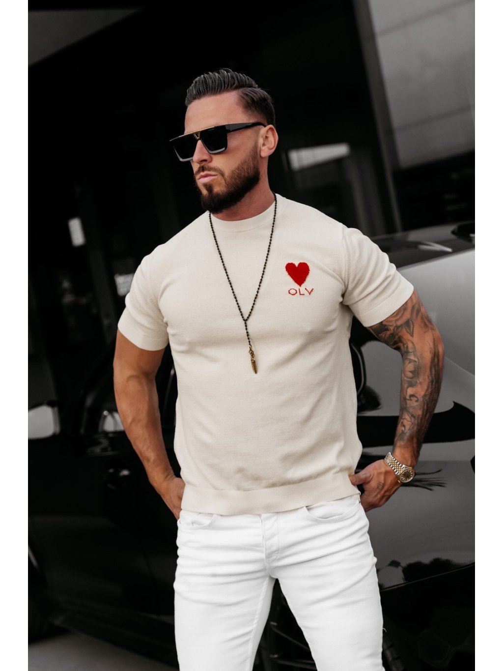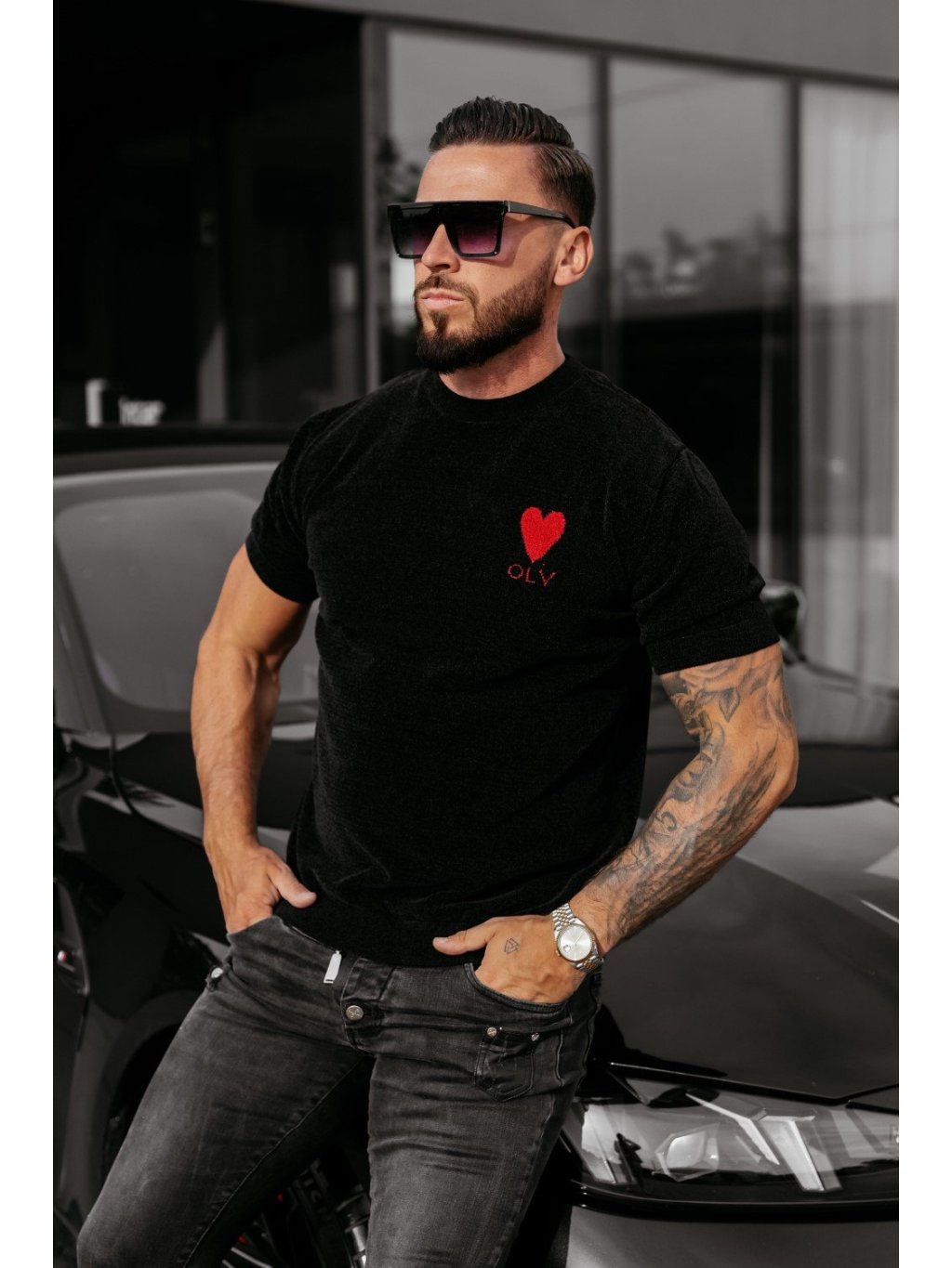 Model má výšku 185 cm a nosí velikost L. Pánské tričko ležérního střihu slim fit, vyrobeno z kvalitního, elastického a příjemného materiálu na dotek. Hladká sedla na okrajích zajišťují pohodlí a perfektní střih. Výrazná červená grafika srdce na přední straně s nápisem OLV uvnitř dodává tričku osobitý vzhled. Vynikající volba pro oživení každodenních outfitů.