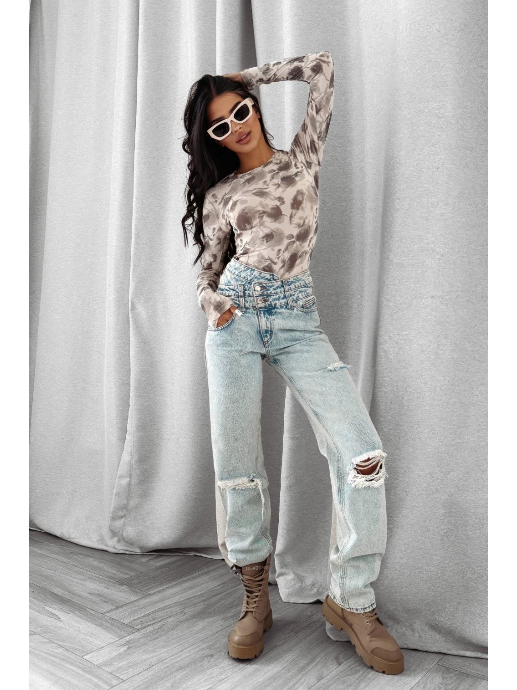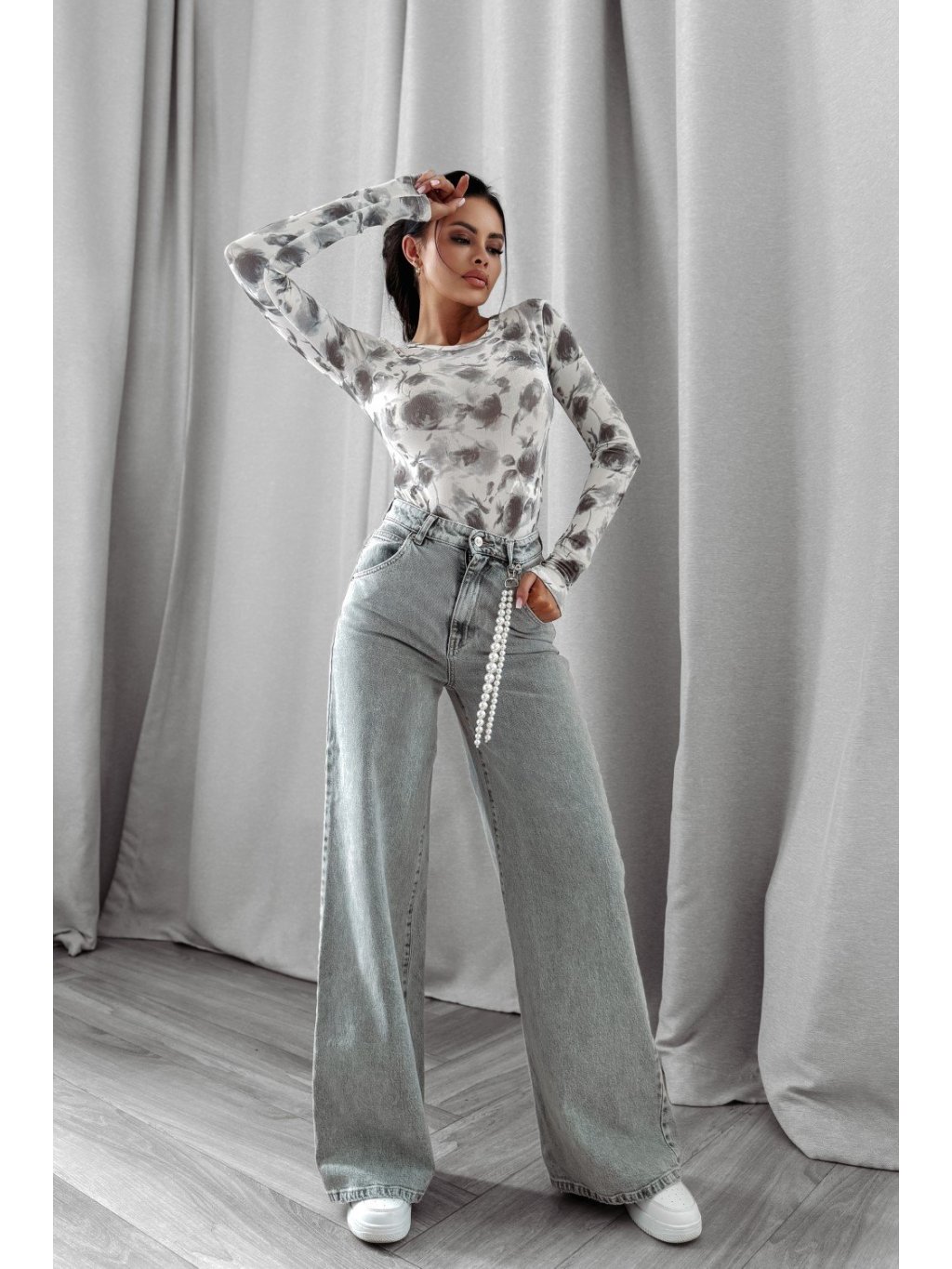 Modelka má výšku 165 cm a nosí velikost S. Dokonale padnoucí body s dlouhým rukávem vyrobené z kvalitního, elastického a prodyšného materiálu. Materiál je zdoben jemným šedým květinovým vzorem a decentním ručně psaným logem OLAVOGA na přední straně. Střih je klasický, s kulatým výstřihem a zapínáním na patentní druk ve spodní části.