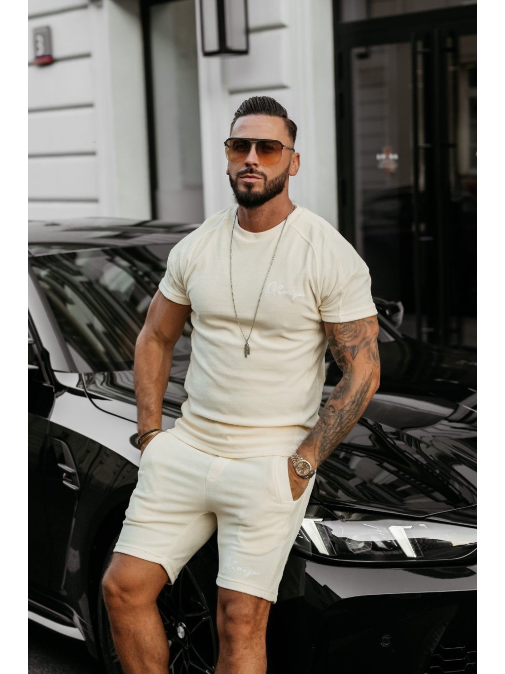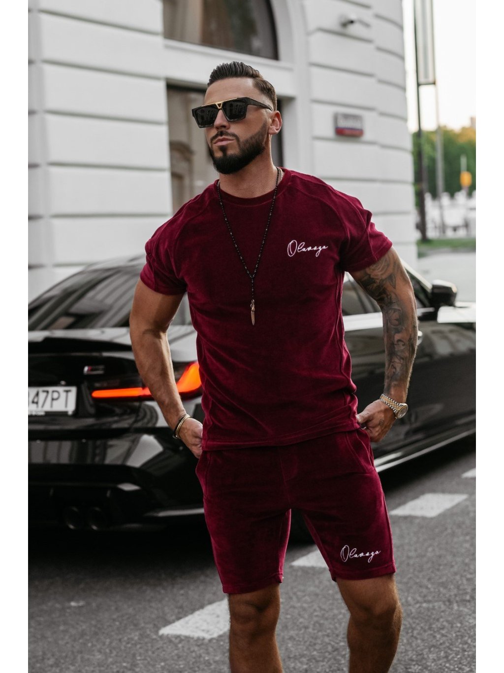 Model má výšku 185 cm a nosí velikost L. Pohodlná, ležérní pánská souprava vyrobená z měkké, vysoce kvalitní BAVLNY připomínající semiš - ideální pro každodenní nošení nebo volnočasové aktivity. Triko s krátkým rukávem s několika ozdobnými švy, minimalistickou výšivkou loga OLAVOGA vpředu a nápisem OLV vzadu. Pánské šortky, stahovací šňůrka, nastavitelný pás, boční kapsy a výšivka loga vpředu.