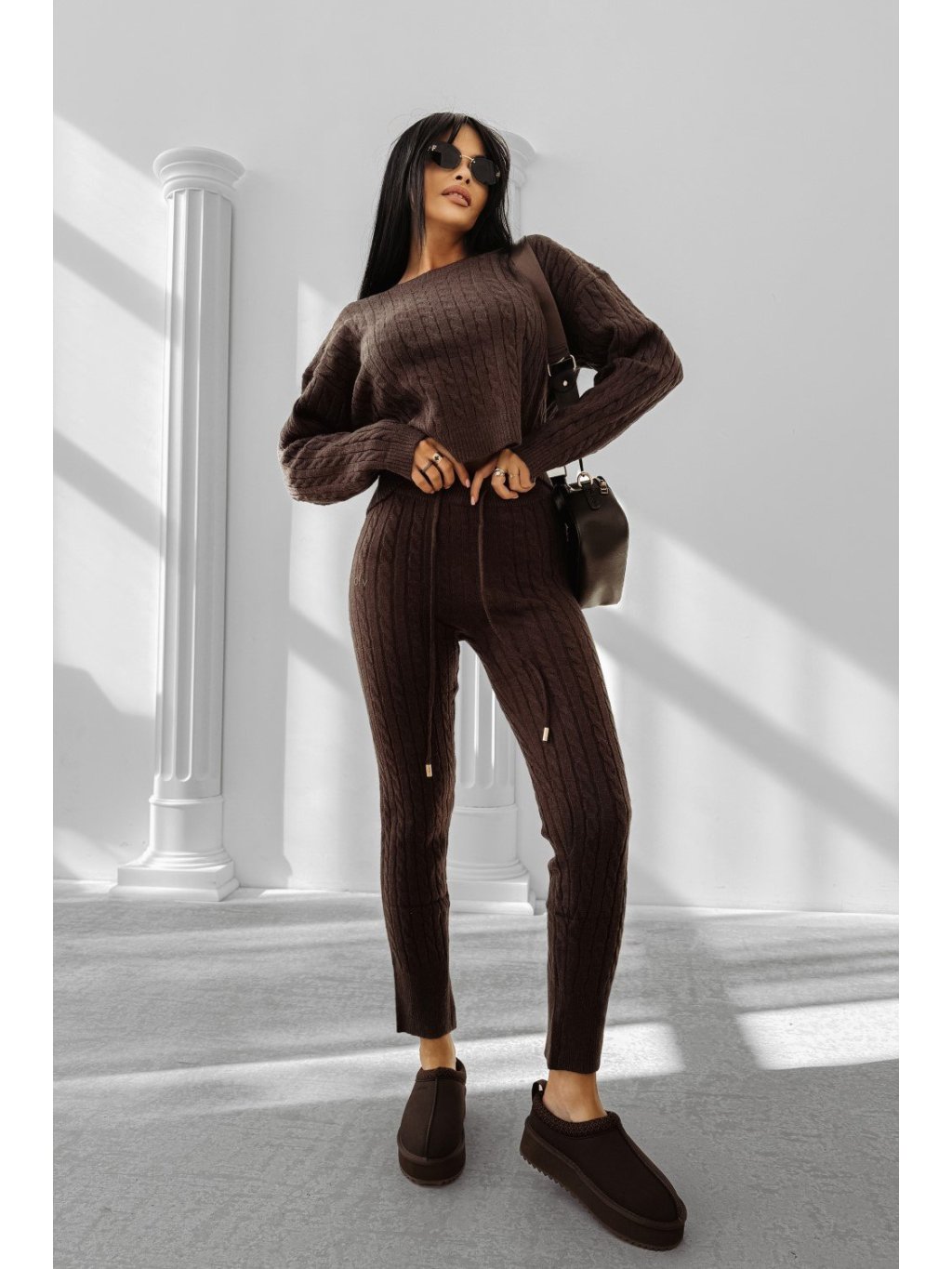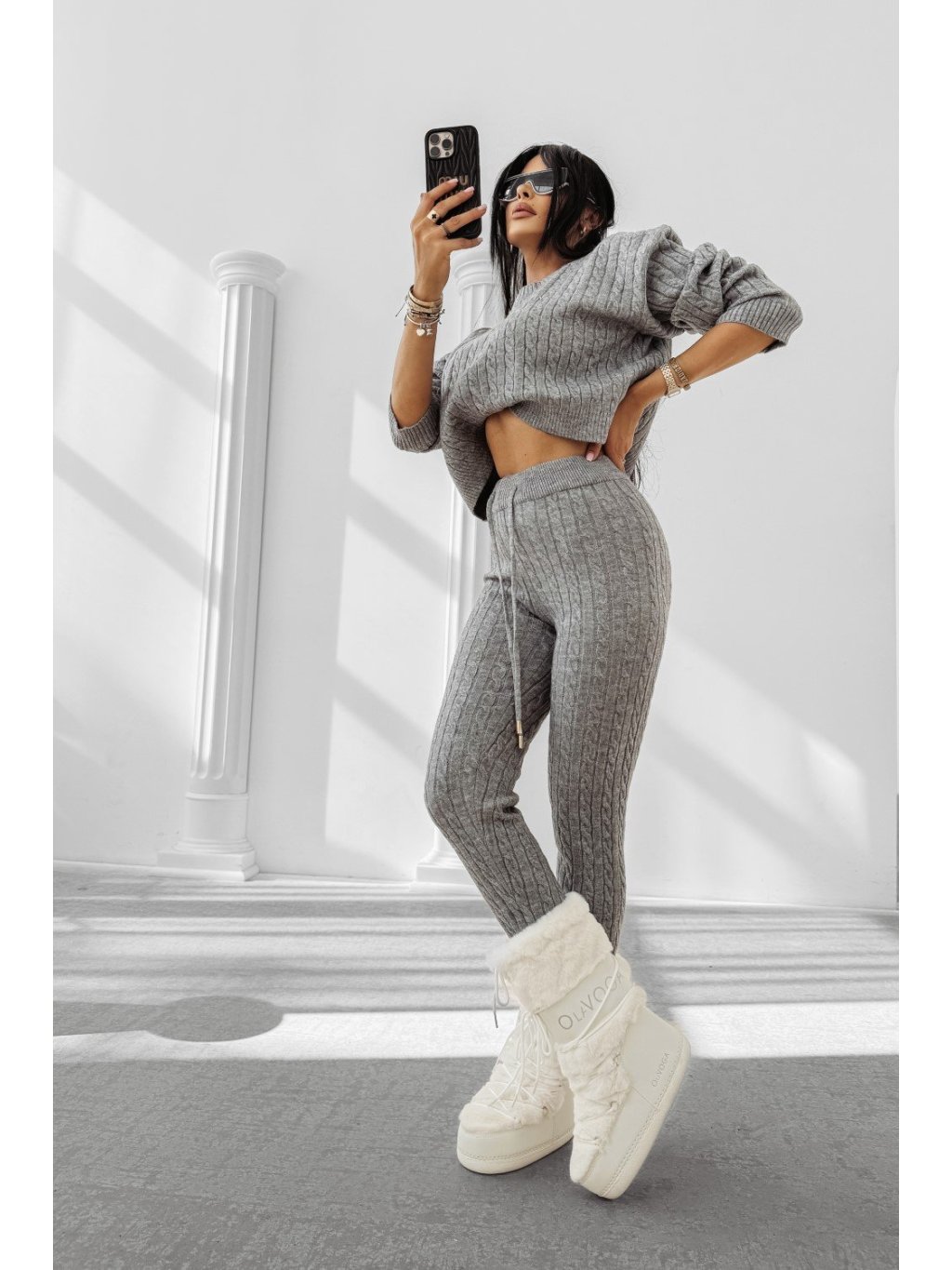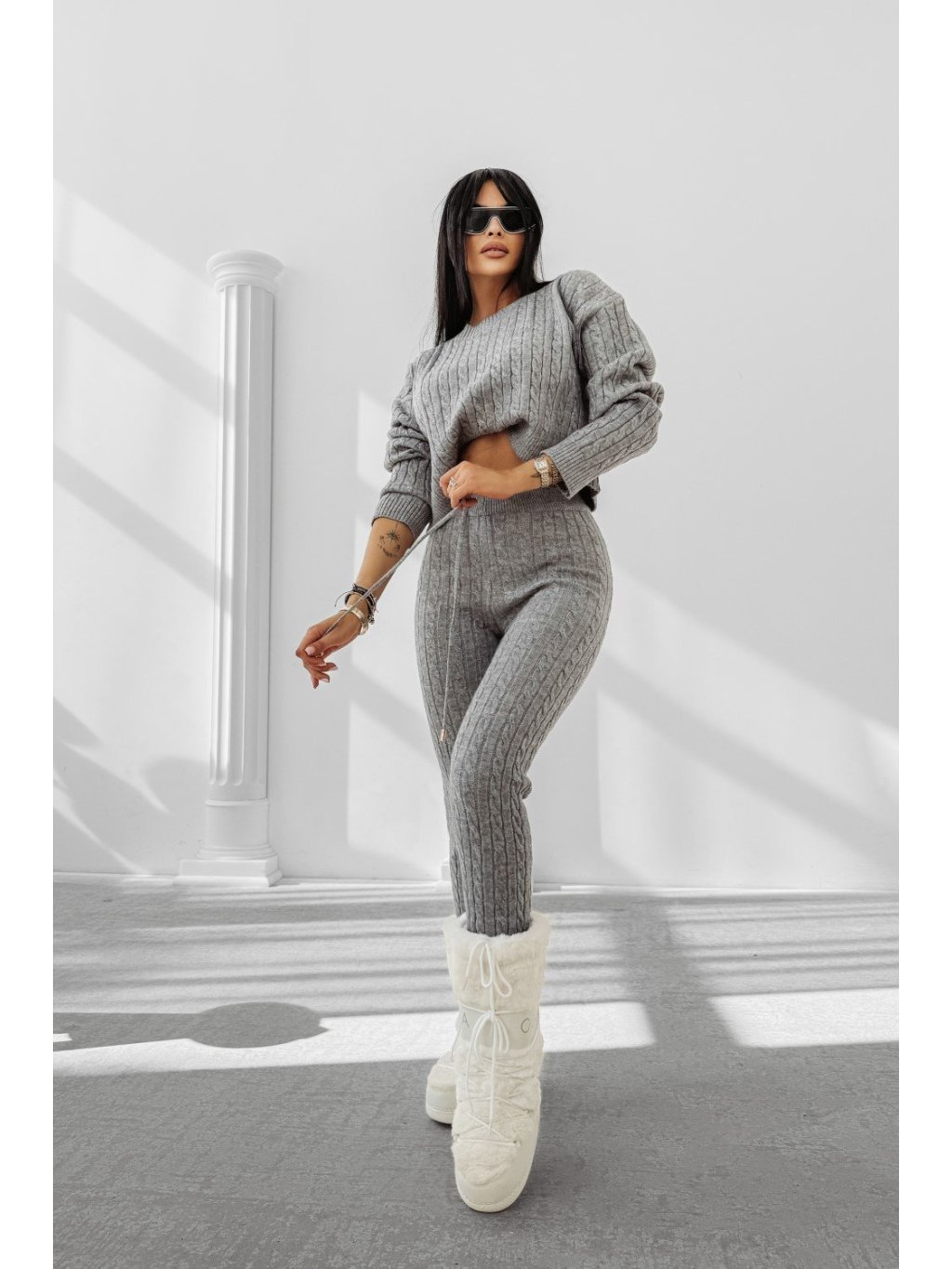 Pohodlné Vypasované súprava puha kötött anyagból. Horná časť: kapucnis pulóver. Spodok: magas derekú Nohavice. Elöl logónyomattal díszítve, amely Športové és modern karaktert ad.