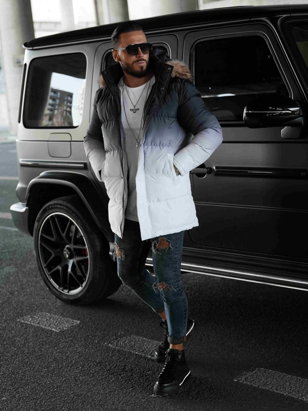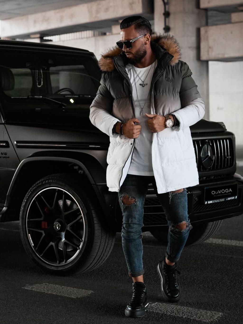 Pánska dlhá bunda s kapucňou a kožušinovými detailmi. Bunda s kapucňou a ombré efektom, odopínateľná kapucňa a bočné vrecká. Zdobenie: OLV výšivka vpredu a veľké 3D vyšívané logo OLAVOGA. Nášivka s logom na prstoch.