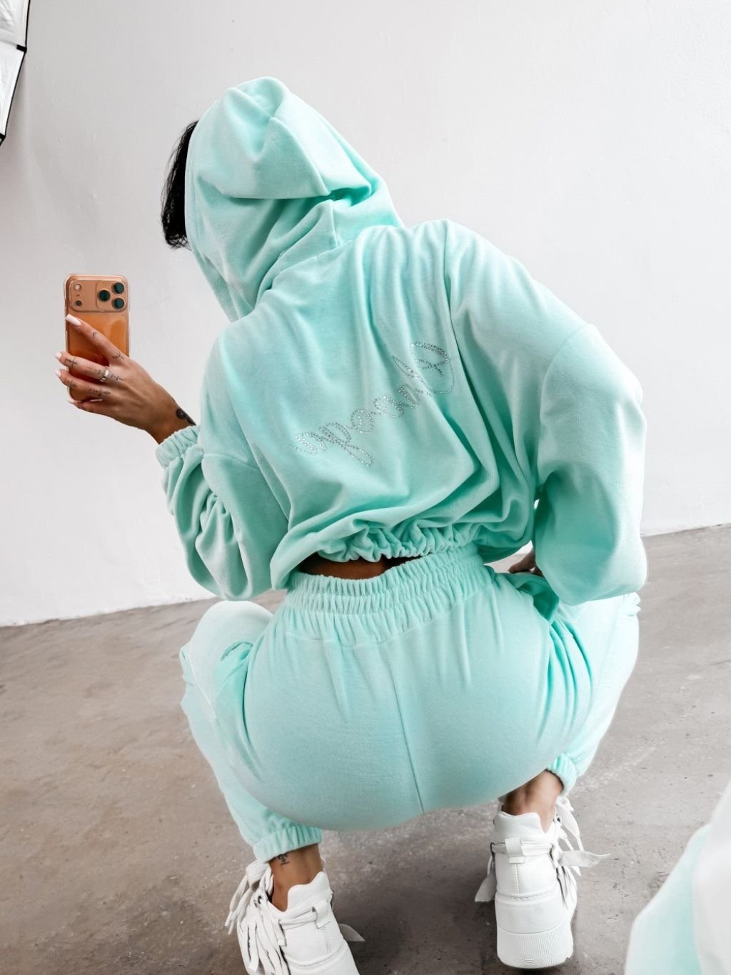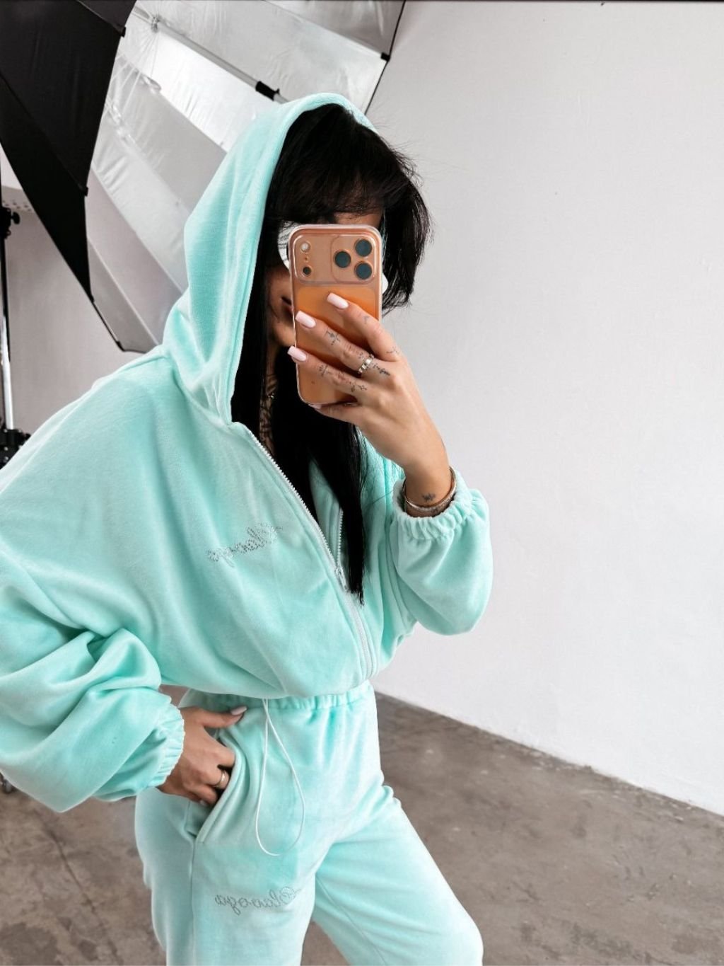 Vrchní část: volný, mírně zkrácený top s kapucí a zapínáním na zip vpředu. Dlouhé rukávy a spodní lem jsou zapínány elastickou stuhou. Hrudník je zdoben třpytivým křišťálovým logem OLAVOGA, zatímco záda jsou zdobena velkým nápisem připomínajícím drahokam.