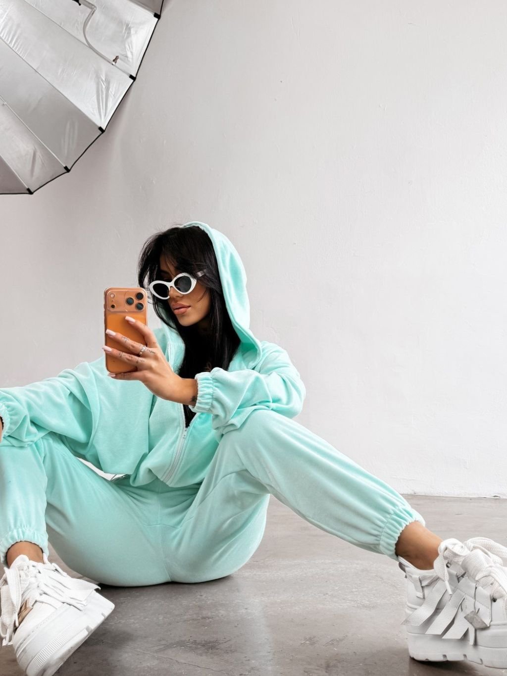 Sametová tepláková souprava s volným a přiléhavým vzhledem Souprava vyrobená z kvalitního, měkkého, na dotek příjemného semišového materiálu, který je stylový i pohodlný zároveň.