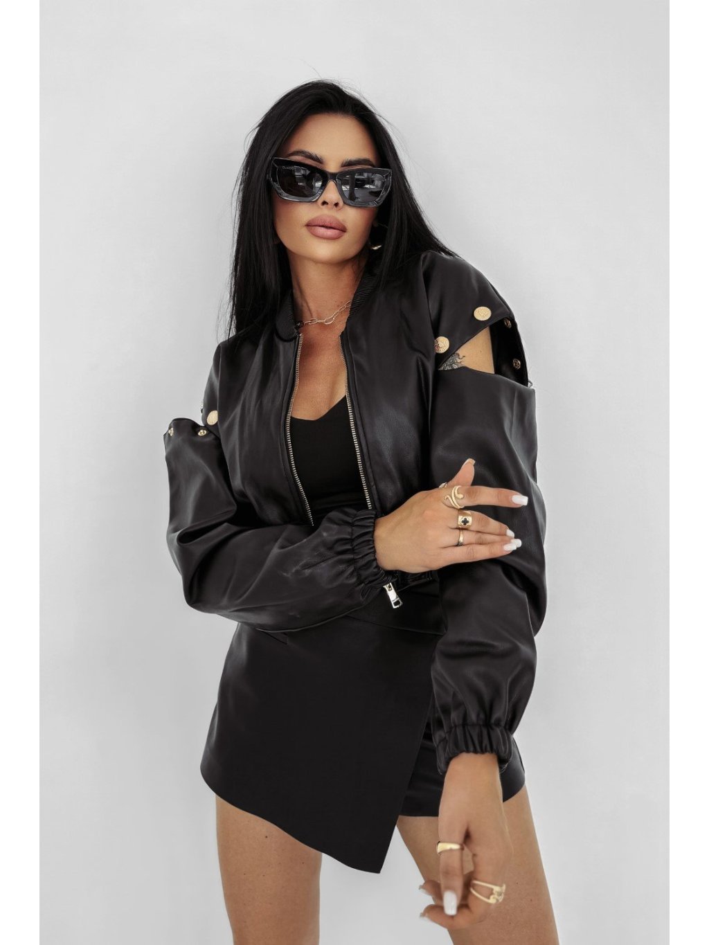 Bunda/vesta z eko kože so zipsom. Stredne dlhý strih. S bočnými vreckami. S kovovým logom na prednej strane.