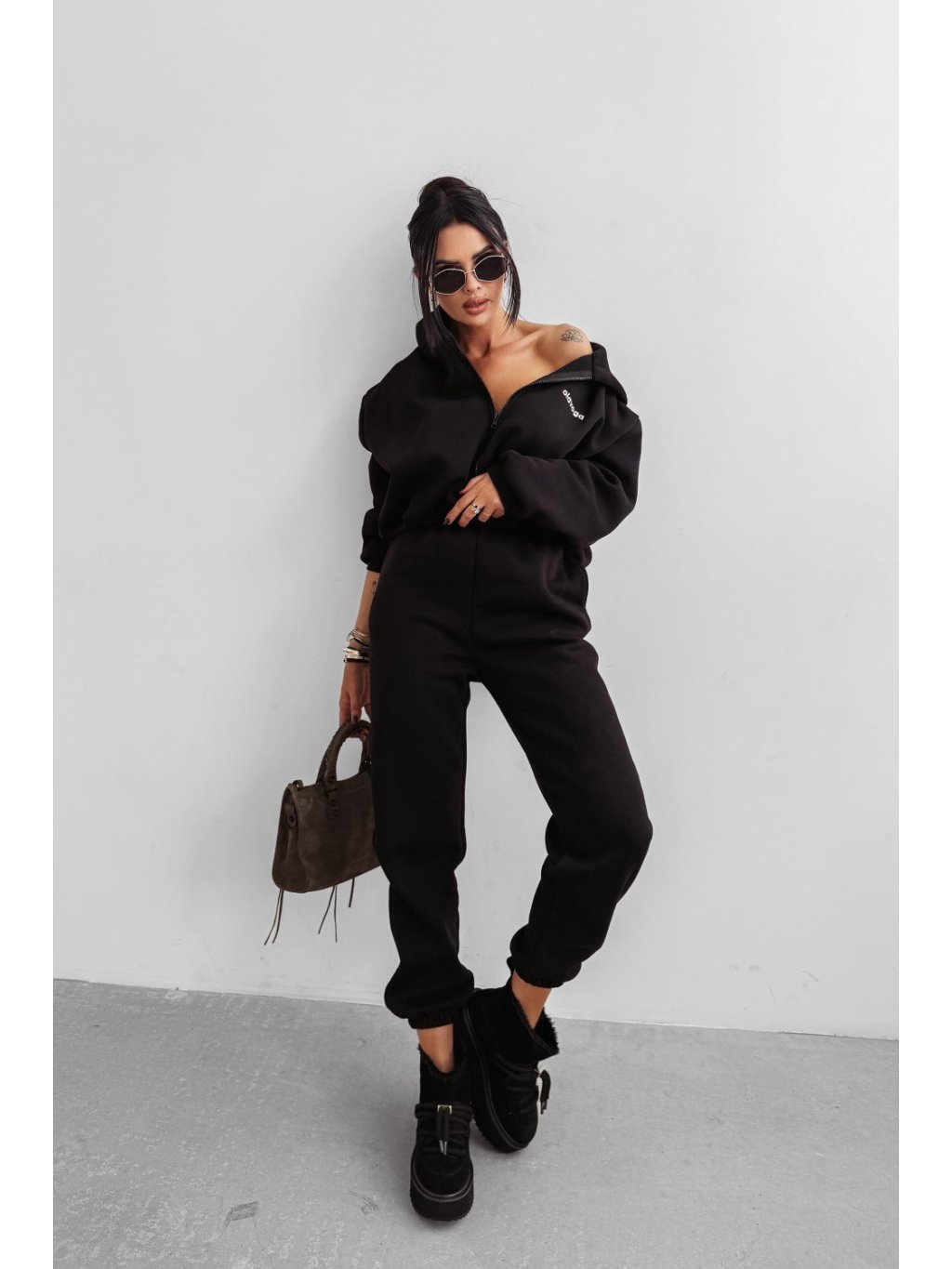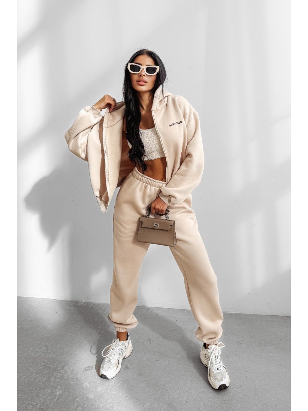 Priliehavá športová súprava zo 100 % BAVLNY. Overisze top s kapucňou a nohavice s vysokým pásom, potlač loga na prednej strane.