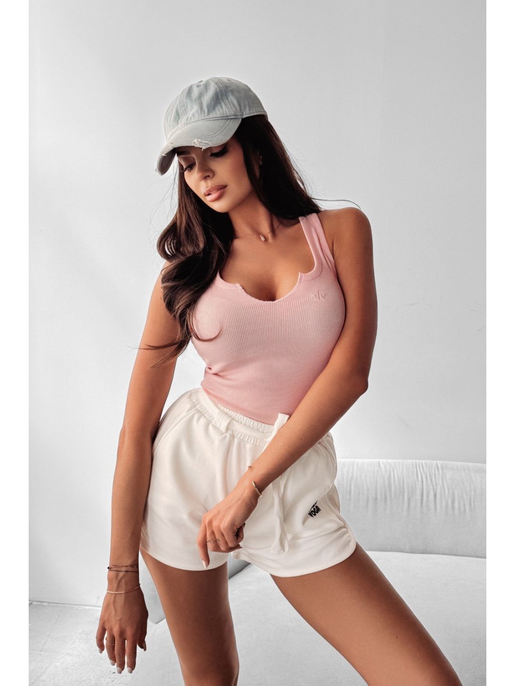 Modelka meria 165 cm a má na sebe klobúky S. Voľné, ale zároveň ženské body bez rukávov vyrobené z kvalitnej, elastickej, rebrovanej látky. Hlboký, zvýraznený výstrih elegantne zvýrazňuje siluetu, zatiaľ čo kontrastná výšivka OLV na prednej strane dodáva moderný, športový vzhľad. Ideálna voľba na každodenné nosenie, ale dá sa ľahko kombinovať aj s elegantnými outfitmi.
