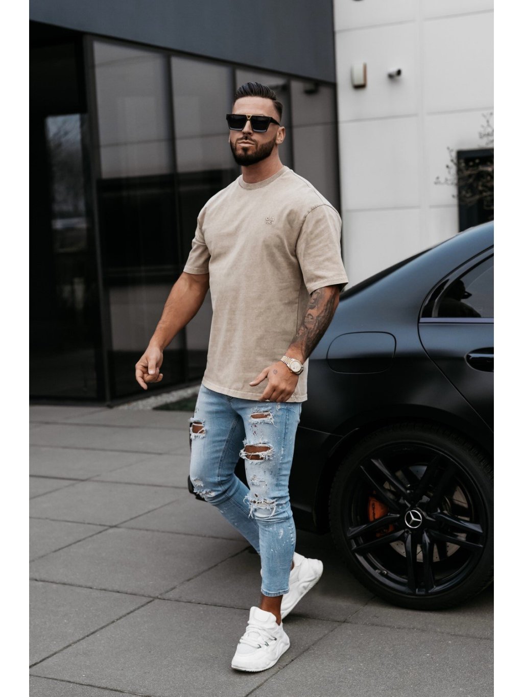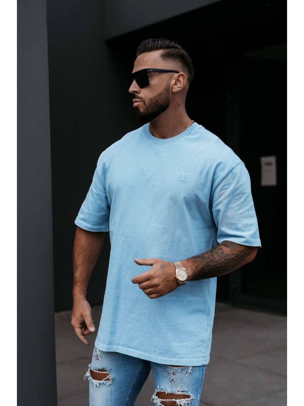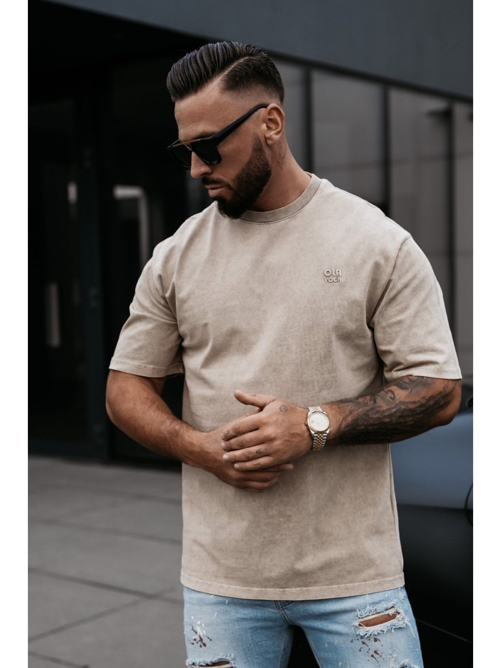 Model je vysoký 185 cm a má na sebe veľkosť L. Pánske tričko slim strihu s krátkym rukávom. Vyrobené z kvalitnej, pružnej bavlny. Tričko má špeciálnu, opotrebovanú povrchovú úpravu. Predná strana je zdobená minimálnym, 3D vyšívaným logom Olavoga.