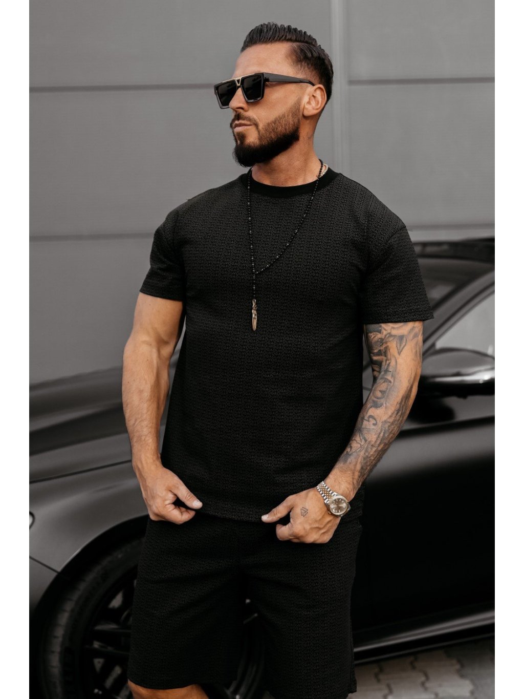 Model má výšku 185 cm a má na sobě velikost L. Pánská souprava vyrobená z vysoce kvalitní, elastické bavlny. Celý výrobek je zdoben jemně reliéfním, opakujícím se logem OLAVOGA. Vrchní díl je klasického střihu s krátkým rukávem, zatímco spodní díl je vyroben z krátkých kalhot s elastickým pasem a bočními kapsami.Složení: 70% bavlna, 30% polyester