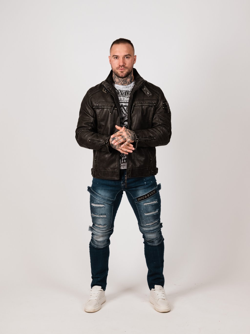 Pánské joggery CIPO & BAXX s koženými detaily, výraznými zipy, kapsami na stehnech a nápisem CB Moderní, jedinečný a nadčasový design se zaměřením na kvalitu a detail.