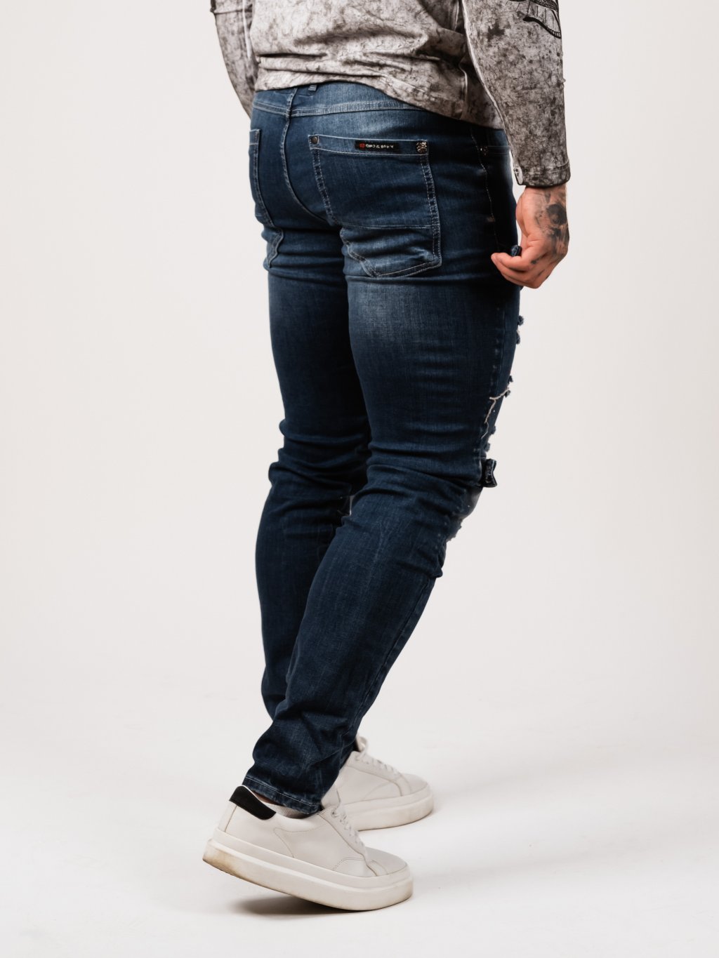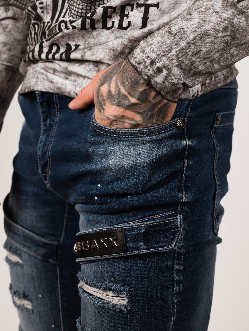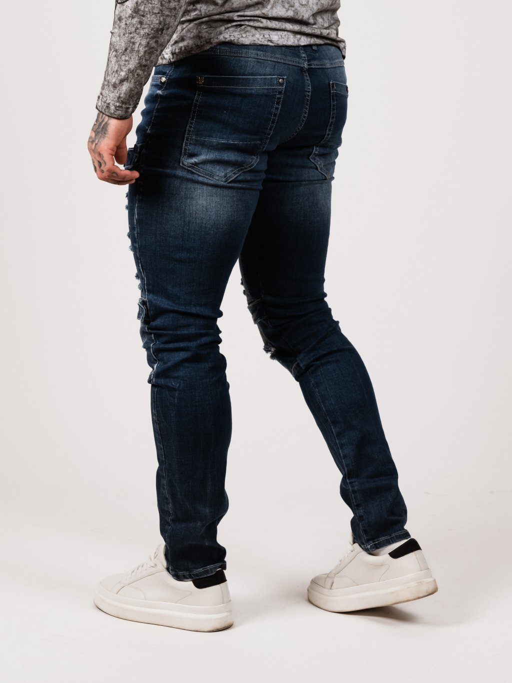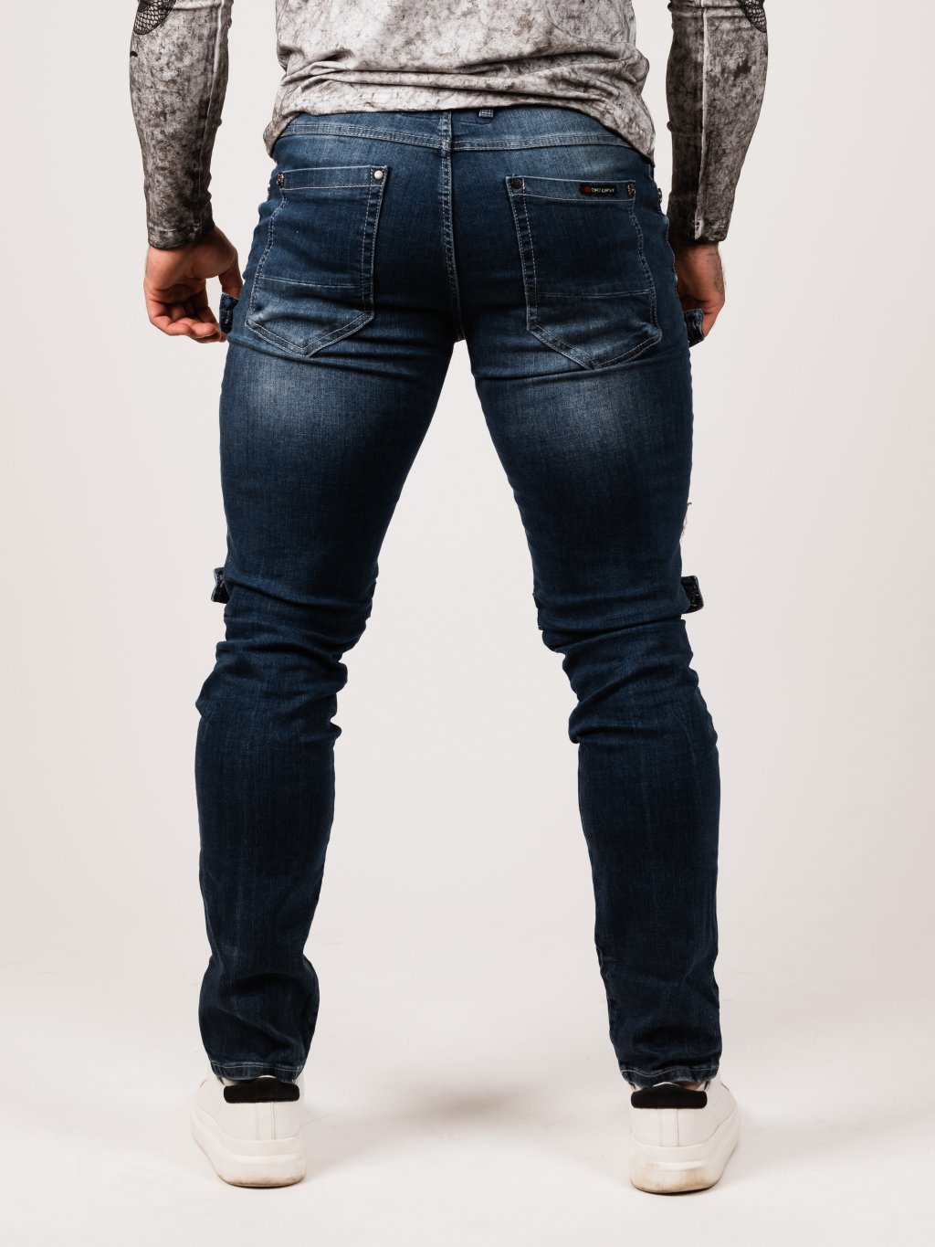 - Zapínání na knoflíky - Ozdobné zipy u kaps - Tření na kalhotách - Ve spodní části kalhot efekt zničení - Prošívání na kalhotách, obšité tlustou nití - Reliéfní...