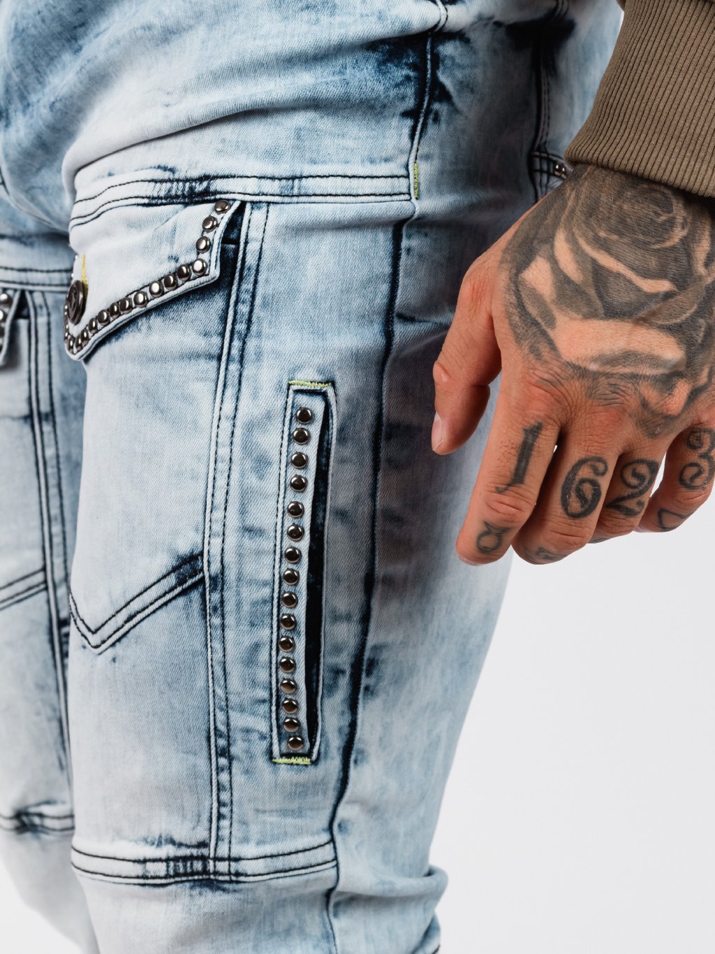 - Pánske džínsy v netradičnom vzhľade - Extravagantná džínsovina rovného strihu - Zapínanie je na zips - S extra látkovými vložkami s maskáčovým vzorom, s nášivkami s logom-...